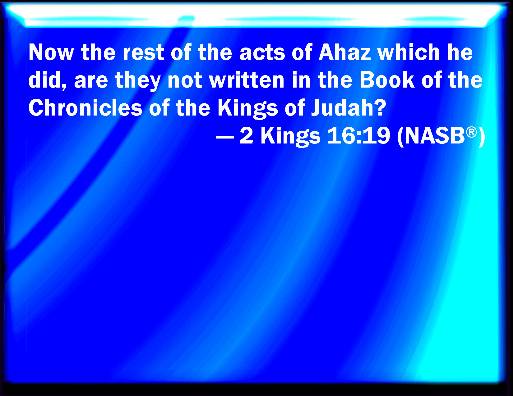 Bible Verse Slide 2 Kings 16:19 Now the rest of the acts of Ahaz which he did, are they not written in the book of the chronicles of the kings of Judah? KJV: Now the rest of the acts of Ahaz which he did, are they not written in the book of the chronicles of the kings of Judah? DRB: Now the rest of the acts of Achaz, which he did, are they not written in the book of the words of the days of the kings of Juda? DBT: And the rest of the acts of Ahaz, what he did, are they not written in the book of the chronicles of the kings of Judah? ERV: Now the rest of the acts of Ahaz which he did, are they not written in the book of the chronicles of the kings of Judah? WBT: Now the rest of the acts of Ahaz which he did, are they not written in the book of the chronicles of the kings of Judah? WEB: Now the rest of the acts of Ahaz which he did, aren't they written in the book of the chronicles of the kings of Judah? YLT: And the rest of the matters of Ahaz that he did, are they not written on the book of the Chronicles of the kings of Judah?Links 2 Kings 16:19 NIV • 2 Kings 16:19 NLT • 2 Kings 16:19 ESV • 2 Kings 16:19 NASB • 2 Kings 16:19 KJV • 2 Kings 16:19 Interlinear • 2 Kings 16:19 Commentaries • 2 Kings 16:19 Parallel Texts • 2 Kings 16:19 Bible Apps • 2 Kings 16:19 Parallel • Bible Hub |