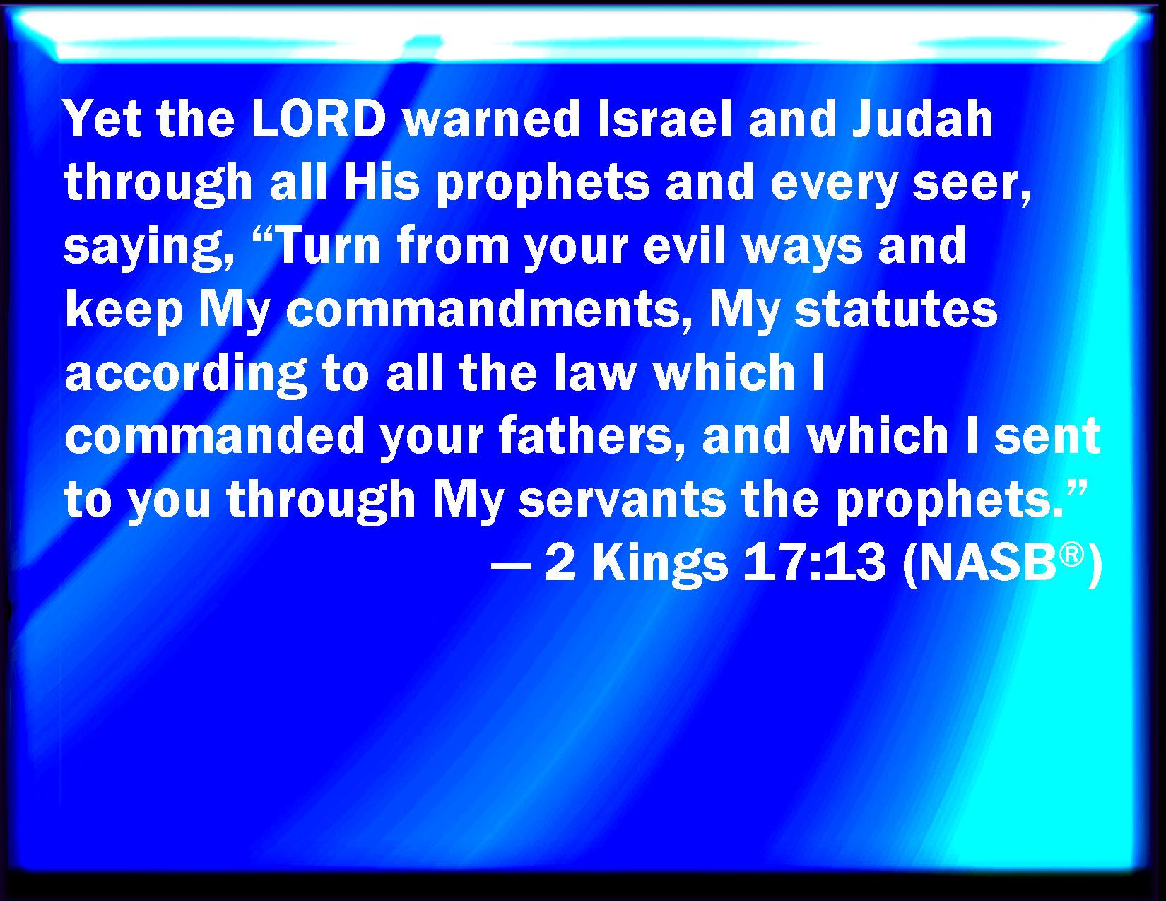 Bible Verse Slide 2 Kings 17:13 Yet the LORD testified against Israel, and against Judah, by all the prophets, and by all the seers, saying, Turn you from your evil ways, and keep my commandments and my statutes, according to all the law which I commanded your fathers, and which I sent to you by my servants the prophets. KJV: Yet the LORD testified against Israel, and against Judah, by all the prophets, and by all the seers, saying, Turn ye from your evil ways, and keep my commandments and my statutes, according to all the law which I commanded your fathers, and which I sent to you by my servants the prophets. DRB: And the Lord testified to them in Israel and in Juda by the hand of all the prophets and seers, saying: Return from your wicked ways, and keep my precepts, and ceremonies, according to all the law which I commanded your fathers: and as I have sent to you in the hand of my servants the prophets. DBT: And Jehovah testified against Israel and against Judah, by all the prophets, all the seers, saying, Turn from your evil ways, and keep my commandments, my statutes, according to all the law which I commanded your fathers, and which I sent to you through my servants the prophets. ERV: Yet the LORD testified unto Israel, and unto Judah, by the hand of every prophet, and of every seer, saying, Turn ye from your evil ways, and keep my commandments and my statutes, according to all the law which I commanded your fathers, and which I sent to you by the hand of my servants the prophets. WBT: Yet the LORD testified against Israel, and against Judah, by all the prophets, and by all the seers, saying, Turn ye from your evil ways, and keep my commandments and my statutes, according to all the law which I commanded your fathers, and which I sent to you by my servants the prophets. WEB: Yet Yahweh testified to Israel, and to Judah, by every prophet, and every seer, saying, "Turn from your evil ways, and keep my commandments and my statutes, according to all the law which I commanded your fathers, and which I sent to you by my servants the prophets." YLT: And Jehovah testifieth against Israel, and against Judah, by the hand of every prophet, and every seer, saying, 'Turn back from your evil ways, and keep My commands, My statutes, according to all the law that I commanded your fathers, and that I sent unto you by the hand of My servants the prophets;'Links 2 Kings 17:13 NIV • 2 Kings 17:13 NLT • 2 Kings 17:13 ESV • 2 Kings 17:13 NASB • 2 Kings 17:13 KJV • 2 Kings 17:13 Interlinear • 2 Kings 17:13 Commentaries • 2 Kings 17:13 Parallel Texts • 2 Kings 17:13 Bible Apps • 2 Kings 17:13 Parallel • Bible Hub |