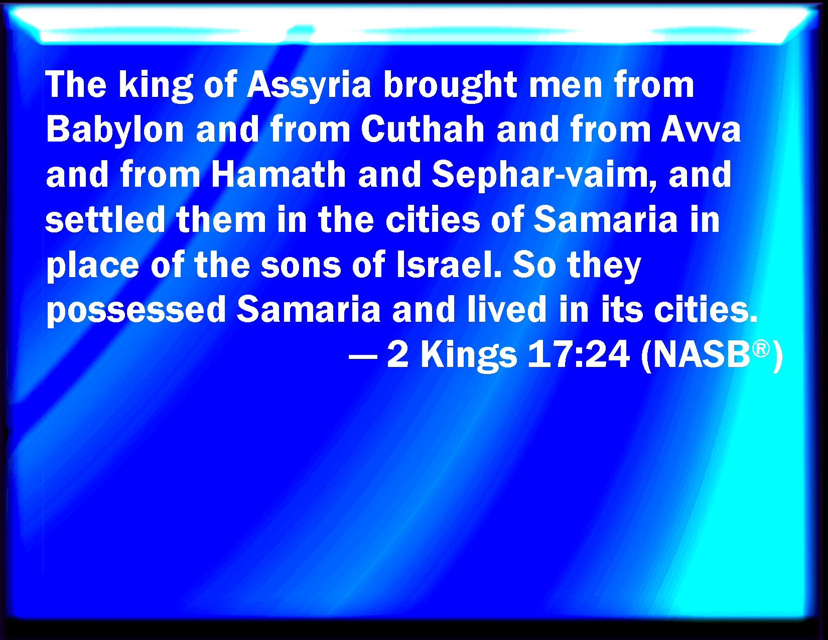 Bible Verse Slide 2 Kings 17:24 And the king of Assyria brought men from Babylon, and from Cuthah, and from Ava, and from Hamath, and from Sepharvaim, and placed them in the cities of Samaria instead of the children of Israel: and they possessed Samaria, and dwelled in the cities thereof. KJV: And the king of Assyria brought men from Babylon, and from Cuthah, and from Ava, and from Hamath, and from Sepharvaim, and placed them in the cities of Samaria instead of the children of Israel: and they possessed Samaria, and dwelt in the cities thereof. DRB: And the king of the Assyrians brought people from Babylon, and from Cutha, and from Avah, and from Emath, and from Sepharvaim: and placed them in the cities of Samaria instead of the children of Israel: and they possessed Samaria, and dwelt in the cities thereof. DBT: And the king of Assyria brought people from Babylon, and from Cuthah, and from Avva, and from Hamath, and from Sepharvaim, and made them dwell in the cities of Samaria instead of the children of Israel; and they possessed Samaria, and dwelt in its cities. ERV: And the king of Assyria brought men from Babylon, and from Cuthah, and from Avva, and from Hamath and Sepharvaim, and placed them in the cities of Samaria instead of the children of Israel: and they possessed Samaria, and dwelt in the cities thereof. WBT: And the king of Assyria brought men from Babylon, and from Cuthah, and from Ava, and from Hamath, and from Sepharvaim, and placed them in the cities of Samaria instead of the children of Israel: and they possessed Samaria, and dwelt in its cities. WEB: The king of Assyria brought men from Babylon, and from Cuthah, and from Avva, and from Hamath and Sepharvaim, and placed them in the cities of Samaria instead of the children of Israel; and they possessed Samaria, and lived in the cities of it. YLT: And the king of Asshur bringeth in from Babylon and from Cutha, and from Ava, and from Hamath, and Sepharvaim, and causeth them to dwell in the cities of Samaria instead of the sons of Israel, and they possess Samaria, and dwell in its cities;Links 2 Kings 17:24 NIV • 2 Kings 17:24 NLT • 2 Kings 17:24 ESV • 2 Kings 17:24 NASB • 2 Kings 17:24 KJV • 2 Kings 17:24 Interlinear • 2 Kings 17:24 Commentaries • 2 Kings 17:24 Parallel Texts • 2 Kings 17:24 Bible Apps • 2 Kings 17:24 Parallel • Bible Hub |