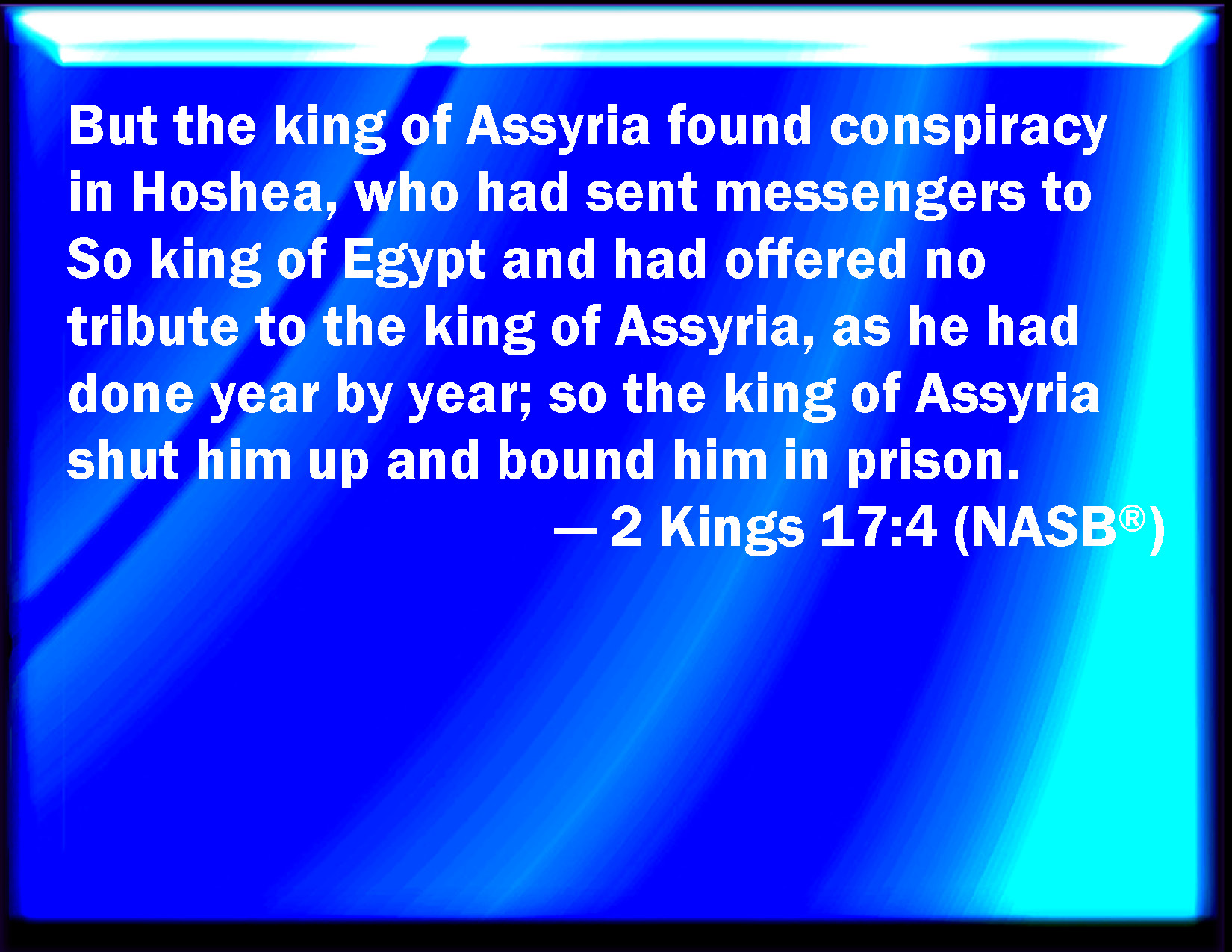 Bible Verse Slide 2 Kings 17:4 And the king of Assyria found conspiracy in Hoshea: for he had sent messengers to So king of Egypt, and brought no present to the king of Assyria, as he had done year by year: therefore the king of Assyria shut him up, and bound him in prison. KJV: And the king of Assyria found conspiracy in Hoshea: for he had sent messengers to So king of Egypt, and brought no present to the king of Assyria, as he had done year by year: therefore the king of Assyria shut him up, and bound him in prison. DRB: And when the king of the Assyrians found that Osee endeavouring to rebel had sent messengers to Sua the king of Egypt, that he might not pay tribute to the king of the Assyrians, as he had done every year, he besieged him, bound him, and cast him into prison, DBT: But the king of Assyria found conspiracy in Hoshea; for he had sent messengers to So king of Egypt, and sent up no present to the king of Assyria as he had done from year to year. And the king of Assyria shut him up and bound him in prison. ERV: And the king of Assyria found conspiracy in Hoshea; for he had sent messengers to So king of Egypt, and offered no present to the king of Assyria, as he had done year by year: therefore the king of Assyria shut him up, and bound him in prison. WBT: And the king of Assyria found conspiracy in Hoshea: for he had sent messengers to So king of Egypt, and brought no present to the king of Assyria, as he had done year by year: therefore the king of Assyria shut him up, and bound him in prison. WEB: The king of Assyria found conspiracy in Hoshea; for he had sent messengers to So king of Egypt, and offered no tribute to the king of Assyria, as he had done year by year: therefore the king of Assyria shut him up, and bound him in prison. YLT: And the king of Asshur findeth in Hoshea a conspiracy, in that he hath sent messengers unto So king of Egypt, and hath not caused a present to go up to the king of Asshur, as year by year, and the king of Asshur restraineth him, and bindeth him in a house of restraint.Links 2 Kings 17:4 NIV • 2 Kings 17:4 NLT • 2 Kings 17:4 ESV • 2 Kings 17:4 NASB • 2 Kings 17:4 KJV • 2 Kings 17:4 Interlinear • 2 Kings 17:4 Commentaries • 2 Kings 17:4 Parallel Texts • 2 Kings 17:4 Bible Apps • 2 Kings 17:4 Parallel • Bible Hub |
