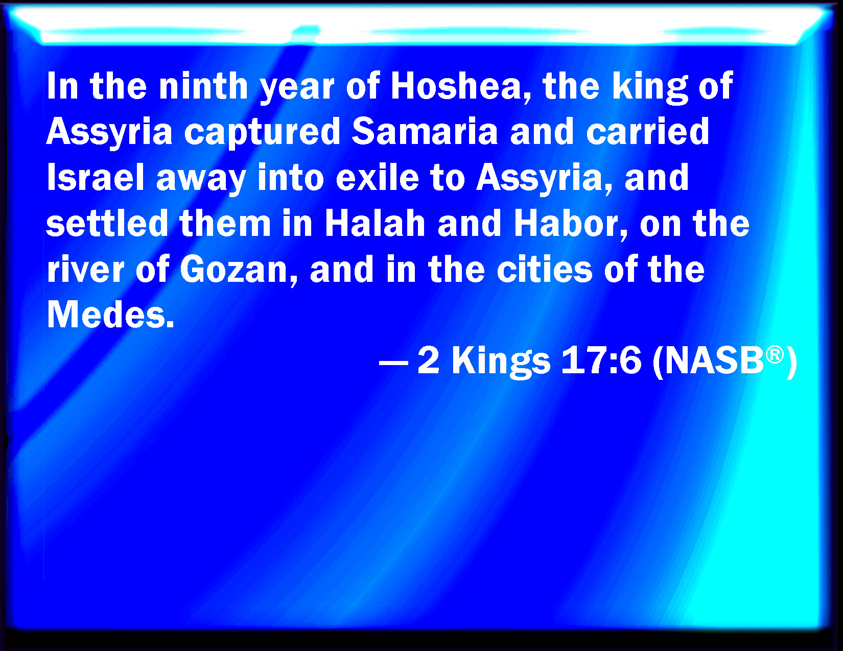 Bible Verse Slide 2 Kings 17:6 In the ninth year of Hoshea the king of Assyria took Samaria, and carried Israel away into Assyria, and placed them in Halah and in Habor by the river of Gozan, and in the cities of the Medes. KJV: In the ninth year of Hoshea the king of Assyria took Samaria, and carried Israel away into Assyria, and placed them in Halah and in Habor by the river of Gozan, and in the cities of the Medes. DRB: And in the ninth year of Osee, the king of the Assyrians took Samaria, and carried Israel away to Assyria: and he placed them in Hala and Habor by the river of Gozan, in the cities of the Medes. DBT: In the ninth year of Hoshea, the king of Assyria took Samaria, and carried Israel away into Assyria, and placed them in Halah and by the Habor, the river of Gozan, and in the cities of the Medes. ERV: In the ninth year of Hoshea, the king of Assyria took Samaria, and carried Israel away unto Assyria, and placed them in Halah, and in Habor, on the river of Gozan, and in the cities of the Medes. WBT: In the ninth year of Hoshea, the king of Assyria took Samaria, and carried Israel away into Assyria, and placed them in Halah and in Habor by the river of Gozan, and in the cities of the Medes. WEB: In the ninth year of Hoshea the king of Assyria took Samaria, and carried Israel away to Assyria, and placed them in Halah, and on the Habor, the river of Gozan, and in the cities of the Medes. YLT: in the ninth year of Hoshea hath the king of Asshur captured Samaria, and removeth Israel to Asshur, and causeth them to dwell in Halah, and in Habor, by the river Gozan, and in the cities of the Medes.Links 2 Kings 17:6 NIV • 2 Kings 17:6 NLT • 2 Kings 17:6 ESV • 2 Kings 17:6 NASB • 2 Kings 17:6 KJV • 2 Kings 17:6 Interlinear • 2 Kings 17:6 Commentaries • 2 Kings 17:6 Parallel Texts • 2 Kings 17:6 Bible Apps • 2 Kings 17:6 Parallel • Bible Hub |