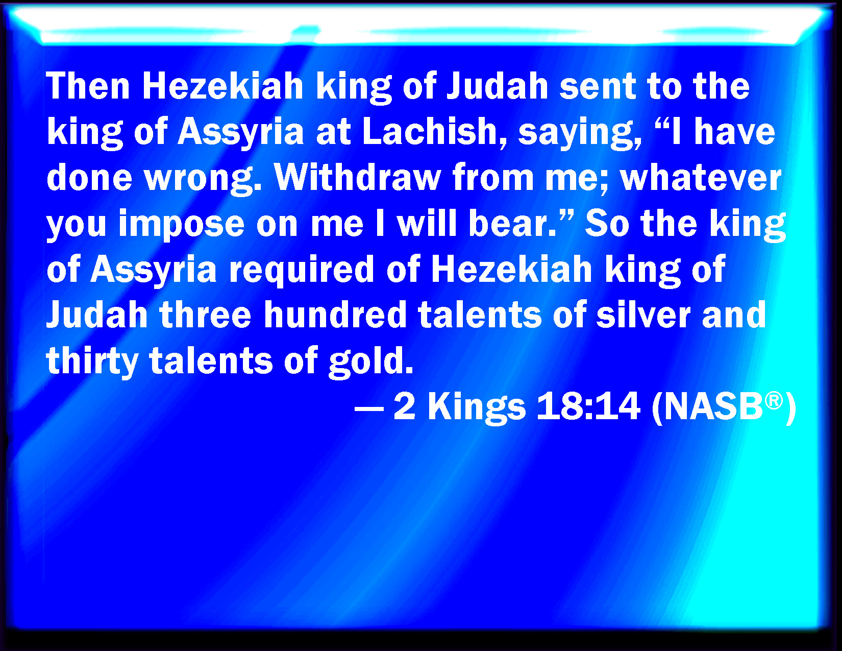 2 Kings 18:14 And Hezekiah king of Judah sent to the king of Assyria to Lachish, saying, I have offended; return from me: that which you put on me will I bear. And the king of Assyria appointed to Hezekiah king of Judah three hundred talents of silver and thirty talents of gold.