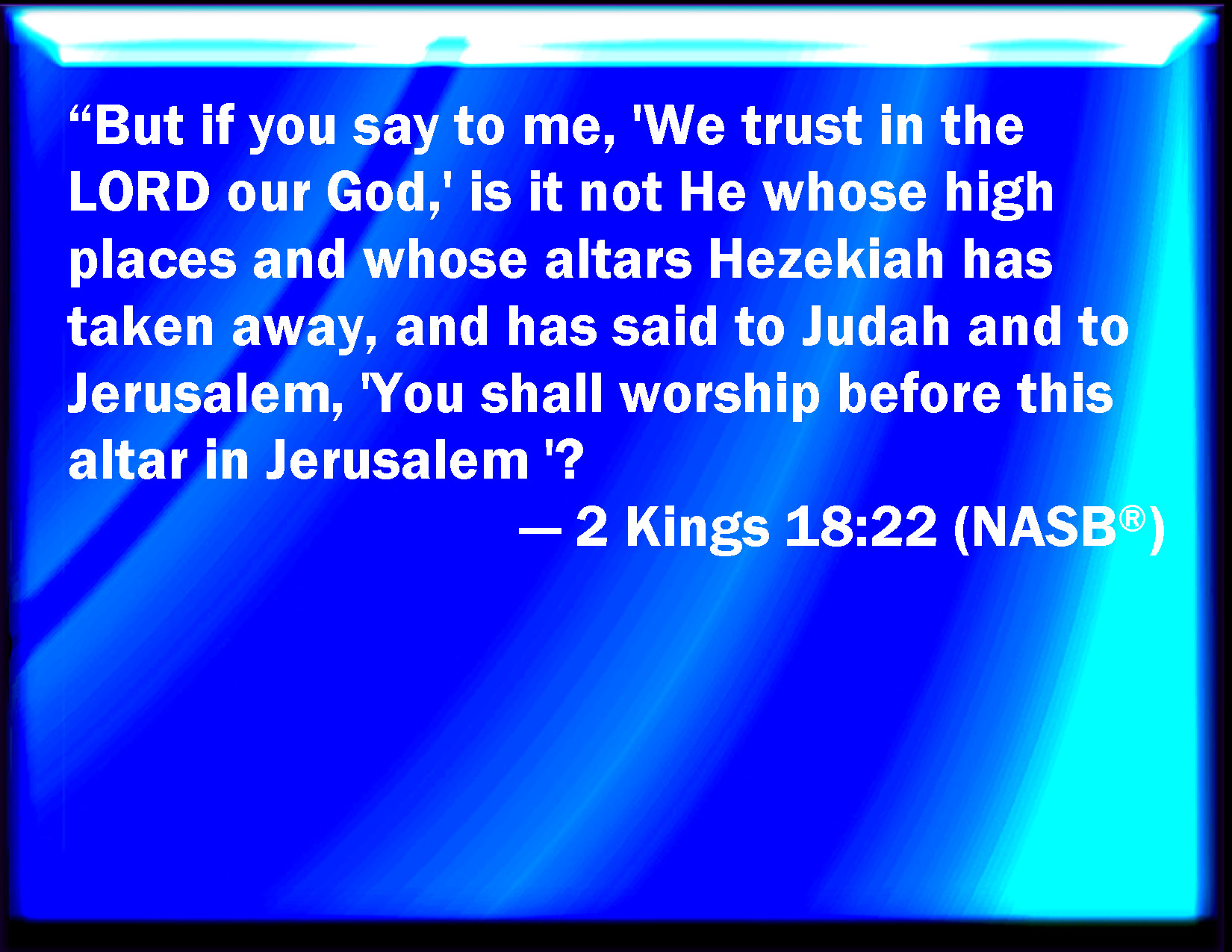 Bible Verse Slide 2 Kings 18:22 But if you say to me, We trust in the LORD our God: is not that he, whose high places and whose altars Hezekiah has taken away, and has said to Judah and Jerusalem, You shall worship before this altar in Jerusalem? KJV: But if ye say unto me, We trust in the LORD our God: is not that he, whose high places and whose altars Hezekiah hath taken away, and hath said to Judah and Jerusalem, Ye shall worship before this altar in Jerusalem? DRB: But if you say to me: We trust in the Lord our God: is it not he, whose high places and altars Ezechias hath taken away: and hath commanded Juda and Jerusalem: You shall worship before this altar in Jerusalem? DBT: And if ye say to me, We rely upon Jehovah our God: is it not he whose high places and whose altars Hezekiah has removed, saying to Judah and Jerusalem, Ye shall worship before this altar in Jerusalem? ERV: But if ye say unto me, We trust in the LORD our God: is not that he, whose high places and whose altars Hezekiah hath taken away, and hath said to Judah and to Jerusalem, Ye shall worship before this altar in Jerusalem? WBT: But if ye say to me, We trust in the LORD our God: is not that he whose high places and whose altars Hezekiah hath taken away, and hath said to Judah and Jerusalem, Ye shall worship before this altar in Jerusalem? WEB: But if you tell me, 'We trust in Yahweh our God;' isn't that he whose high places and whose altars Hezekiah has taken away, and has said to Judah and to Jerusalem, 'You shall worship before this altar in Jerusalem?' YLT: 'And when ye say unto me, Unto Jehovah our God we have trusted, is it not He whose high places and whose altars Hezekiah hath turned aside, and saith to Judah and to Jerusalem, Before this altar do ye bow yourselves in Jerusalem?Links 2 Kings 18:22 NIV • 2 Kings 18:22 NLT • 2 Kings 18:22 ESV • 2 Kings 18:22 NASB • 2 Kings 18:22 KJV • 2 Kings 18:22 Interlinear • 2 Kings 18:22 Commentaries • 2 Kings 18:22 Parallel Texts • 2 Kings 18:22 Bible Apps • 2 Kings 18:22 Parallel • Bible Hub |