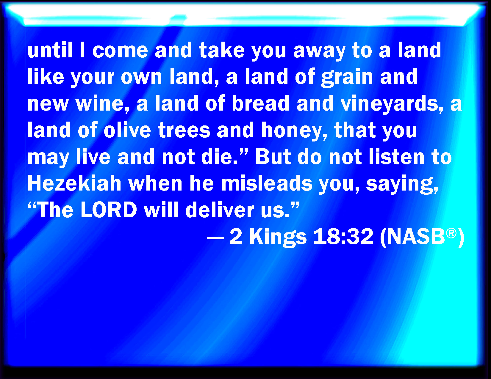 Bible Verse Slide 2 Kings 18:32 Until I come and take you away to a land like your own land, a land of corn and wine, a land of bread and vineyards, a land of oil olive and of honey, that you may live, and not die: and listen not to Hezekiah, when he persuades you, saying, The LORD will deliver us. KJV: Until I come and take you away to a land like your own land, a land of corn and wine, a land of bread and vineyards, a land of oil olive and of honey, that ye may live, and not die: and hearken not unto Hezekiah, when he persuadeth you, saying, The LORD will deliver us. DRB: Till I come, and take you away to a land, like to your own land, a fruitful land, and plentiful in wine, a land of bread and vineyards, a land of olives, and oil and honey, and you shall live, and not die. Hearken not to Ezechias, who deceiveth you, saying: The Lord will deliver us. DBT: until I come and take you away to a land like your own land, a land of corn and wine, a land of bread and vineyards, a land of olive-trees and of honey, that ye may live and not die; and hearken not to Hezekiah, when he persuades you, saying, Jehovah will deliver us. ERV: Until I come and take you away to a land like your own land, a land of corn and wine, a land of bread and vineyards, a land of oil olive and of honey, that ye may live, and not die: and hearken not unto Hezekiah, when he persuadeth you, saying, The LORD will deliver us. WBT: Until I come and take you away to a land like your own land, a land of corn and wine, a land of bread and vineyards, a land of olive-oil and of honey, that ye may live, and not die: and hearken not to Hezekiah, when he persuadeth you, saying, The LORD will deliver us. WEB: until I come and take you away to a land like your own land, a land of grain and new wine, a land of bread and vineyards, a land of olive trees and of honey, that you may live, and not die. Don't listen to Hezekiah, when he persuades you, saying, "Yahweh will deliver us." YLT: till my coming in, and I have taken you unto a land like your own land, a land of corn and new wine, a land of bread and vineyards, a land of oil olive, and honey, and live, and die not; and do not hearken unto Hezekiah, when he persuadeth you, saying, Jehovah doth deliver us.Links 2 Kings 18:32 NIV • 2 Kings 18:32 NLT • 2 Kings 18:32 ESV • 2 Kings 18:32 NASB • 2 Kings 18:32 KJV • 2 Kings 18:32 Interlinear • 2 Kings 18:32 Commentaries • 2 Kings 18:32 Parallel Texts • 2 Kings 18:32 Bible Apps • 2 Kings 18:32 Parallel • Bible Hub |