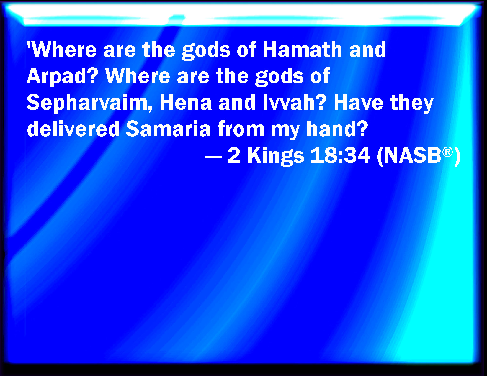 Bible Verse Slide 2 Kings 18:34 Where are the gods of Hamath, and of Arpad? where are the gods of Sepharvaim, Hena, and Ivah? have they delivered Samaria out of my hand? KJV: Where are the gods of Hamath, and of Arpad? where are the gods of Sepharvaim, Hena, and Ivah? have they delivered Samaria out of mine hand? DRB: Where is the god of Emath, end of Arphad? where is the god of Sepharvaim, of Ana, and of Ava? have they delivered Samaria out of my hand? DBT: Where are the gods of Hamath and of Arpad? Where are the gods of Sepharvaim, Hena, and Ivvah? and have they delivered Samaria out of my hand? ERV: Where are the gods of Hamath, and of Arpad? where are the gods of Sepharvaim, of Hena, and Ivvah? have they delivered Samaria out of my hand? WBT: Where are the gods of Hamath, and of Arpad? where are the gods of Sepharvaim, Hena, and Ivah? have they delivered Samaria out of my hand? WEB: Where are the gods of Hamath, and of Arpad? Where are the gods of Sepharvaim, of Hena, and Ivvah? Have they delivered Samaria out of my hand? YLT: Where are the gods of Hamath and Arpad? where the gods of Sepharvaim, Hena, and Ivvah, that they have delivered Samaria out of my hand?Links 2 Kings 18:34 NIV • 2 Kings 18:34 NLT • 2 Kings 18:34 ESV • 2 Kings 18:34 NASB • 2 Kings 18:34 KJV • 2 Kings 18:34 Interlinear • 2 Kings 18:34 Commentaries • 2 Kings 18:34 Parallel Texts • 2 Kings 18:34 Bible Apps • 2 Kings 18:34 Parallel • Bible Hub |