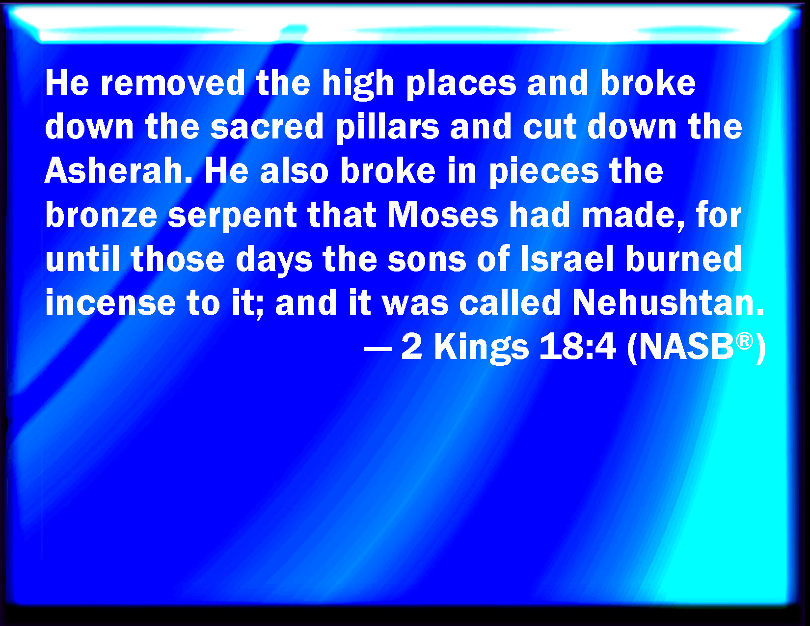 Bible Verse Slide 2 Kings 18:4 He removed the high places, and broke the images, and cut down the groves, and broke in pieces the brazen serpent that Moses had made: for to those days the children of Israel did burn incense to it: and he called it Nehushtan. KJV: He removed the high places, and brake the images, and cut down the groves, and brake in pieces the brasen serpent that Moses had made: for unto those days the children of Israel did burn incense to it: and he called it Nehushtan. DRB: He destroyed the n high places, and broke the statues in pieces, and cut down the groves, and broke the brazen serpent, which Moses had made: for till that time the children of Israel burnt incense to it: and he called its name Nohestan. DBT: He removed the high places, and broke the columns, and cut down the Asherahs, and broke in pieces the serpent of brass that Moses had made; for to those days the children of Israel burned incense to it: and he called it Nehushtan. ERV: He removed the high places, and brake the pillars, and cut down the Asherah: And he brake in pieces the brasen serpent that Moses had made; for unto those days the children of Israel did burn incense to it; and he called it Nehushtan. WBT: He removed the high places, and broke the images, and cut down the groves, and broke in pieces the brazen serpent that Moses had made: for till those days the children of Israel burnt incense to it: and he called it Nehushtan. WEB: He removed the high places, and broke the pillars, and cut down the Asherah: and he broke in pieces the bronze serpent that Moses had made; for to those days the children of Israel did burn incense to it; and he called it Nehushtan. YLT: he hath turned aside the high places, and broken in pieces the standing-pillars, and cut down the shrine, and beaten down the brazen serpent that Moses made, for unto these days were the sons of Israel making perfume to it, and he calleth it 'a piece of brass.'Links 2 Kings 18:4 NIV • 2 Kings 18:4 NLT • 2 Kings 18:4 ESV • 2 Kings 18:4 NASB • 2 Kings 18:4 KJV • 2 Kings 18:4 Interlinear • 2 Kings 18:4 Commentaries • 2 Kings 18:4 Parallel Texts • 2 Kings 18:4 Bible Apps • 2 Kings 18:4 Parallel • Bible Hub |