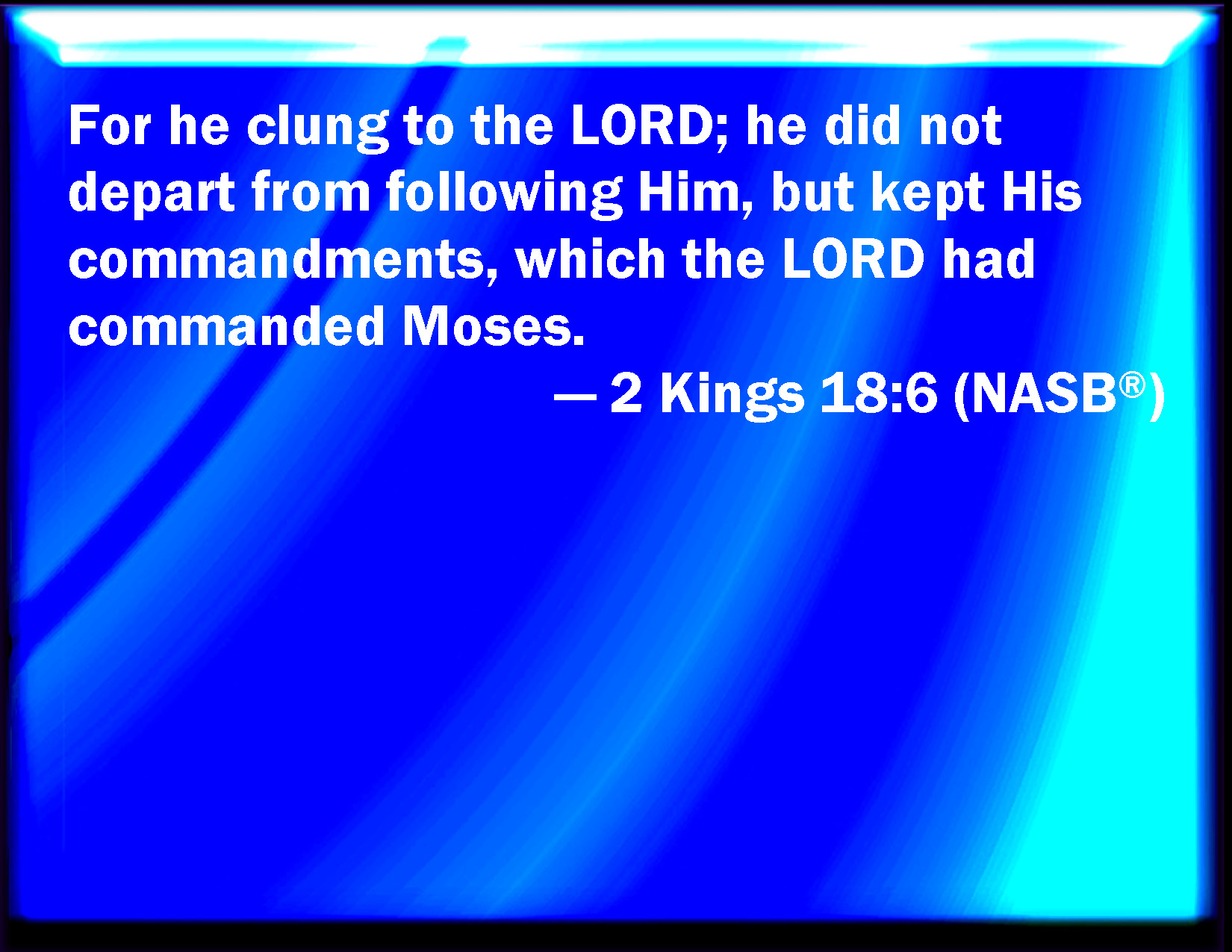 Bible Verse Slide 2 Kings 18:6 For he held to the LORD, and departed not from following him, but kept his commandments, which the LORD commanded Moses. KJV: For he clave to the LORD, and departed not from following him, but kept his commandments, which the LORD commanded Moses. DRB: And he stuck to the Lord, and departed not from his steps, but kept his commandments, which the Lord commanded Moses. DBT: And he clave to Jehovah, and did not turn aside from following him, but kept his commandments, which Jehovah commanded Moses. ERV: For he clave to the LORD, he departed not from following him, but kept his commandments, which the LORD commanded Moses. WBT: For he cleaved to the LORD, and departed not from following him, but kept his commandments, which the LORD commanded Moses. WEB: For he joined with Yahweh; he didn't depart from following him, but kept his commandments, which Yahweh commanded Moses. YLT: and he cleaveth to Jehovah, he hath not turned aside from after Him, and keepeth His commands that Jehovah commanded Moses.Links 2 Kings 18:6 NIV • 2 Kings 18:6 NLT • 2 Kings 18:6 ESV • 2 Kings 18:6 NASB • 2 Kings 18:6 KJV • 2 Kings 18:6 Interlinear • 2 Kings 18:6 Commentaries • 2 Kings 18:6 Parallel Texts • 2 Kings 18:6 Bible Apps • 2 Kings 18:6 Parallel • Bible Hub |