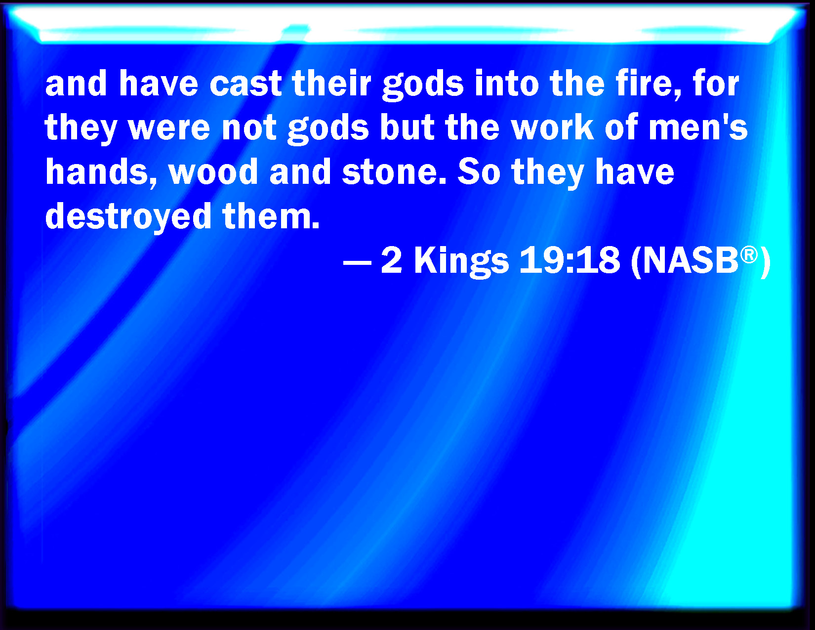 Bible Verse Slide 2 Kings 19:18 And have cast their gods into the fire: for they were no gods, but the work of men's hands, wood and stone: therefore they have destroyed them. KJV: And have cast their gods into the fire: for they were no gods, but the work of men's hands, wood and stone: therefore they have destroyed them. DRB: And they have cast their gods into the fire: for they were not Rods, but the works of men's hands of wood and stone, and they destroyed them. DBT: and have cast their gods into the fire; for they were no gods, but the work of men's hands, wood and stone; therefore have they destroyed them. ERV: and have cast their gods into the fire: for they were no gods, but the work of men's hands, wood and stone; therefore they have destroyed them. WBT: And have cast their gods into the fire: for they were no gods, but the work of men's hands, wood and stone: therefore they have destroyed them. WEB: and have cast their gods into the fire; for they were no gods, but the work of men's hands, wood and stone. Therefore they have destroyed them. YLT: and have put their gods into fire, for they are no gods, but work of the hands of man, wood and stone, and destroy them.Links 2 Kings 19:18 NIV • 2 Kings 19:18 NLT • 2 Kings 19:18 ESV • 2 Kings 19:18 NASB • 2 Kings 19:18 KJV • 2 Kings 19:18 Interlinear • 2 Kings 19:18 Commentaries • 2 Kings 19:18 Parallel Texts • 2 Kings 19:18 Bible Apps • 2 Kings 19:18 Parallel • Bible Hub |