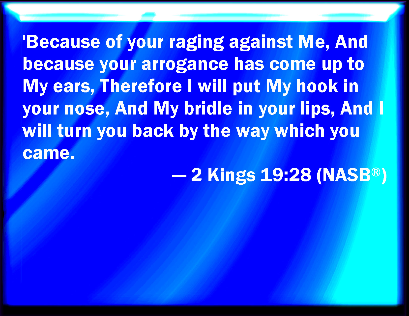 Bible Verse Slide 2 Kings 19:28 Because your rage against me and your tumult is come up into my ears, therefore I will put my hook in your nose, and my bridle in your lips, and I will turn you back by the way by which you came. KJV: Because thy rage against me and thy tumult is come up into mine ears, therefore I will put my hook in thy nose, and my bridle in thy lips, and I will turn thee back by the way by which thou camest. DRB: Thou hast been mad against me, and thy pride hath come up to my ears: therefore I will put a ring in thy nose, and a bit between thy lips, and I will turn thee back by the way, by which thou camest. DBT: Because thy raging against me and thine arrogance is come up into mine ears, I will put my ring in thy nose, and my bridle in thy lips, And I will make thee go back by the way by which thou camest. ERV: Because of thy raging against me, and for that thine arrogancy is come up into mine ears, therefore will I put my hook in thy nose, and my bridle in thy lips, and I will turn thee back by the way by which thou camest. WBT: Because thy rage against me and thy tumult is come up into my ears, therefore I will put my hook in thy nose, and my bridle in thy lips, and I will turn thee back by the way by which thou camest. WEB: Because of your raging against me, and because your arrogance has come up into my ears, therefore will I put my hook in your nose, and my bridle in your lips, and I will turn you back by the way by which you came." YLT: Because of thine anger towards Me, And thy noise — it came up into Mine ears, I have put My hook in thy nose, And My bridle in thy lips, And have caused thee to turn back, In the way in which thou camest.Links 2 Kings 19:28 NIV • 2 Kings 19:28 NLT • 2 Kings 19:28 ESV • 2 Kings 19:28 NASB • 2 Kings 19:28 KJV • 2 Kings 19:28 Interlinear • 2 Kings 19:28 Commentaries • 2 Kings 19:28 Parallel Texts • 2 Kings 19:28 Bible Apps • 2 Kings 19:28 Parallel • Bible Hub |