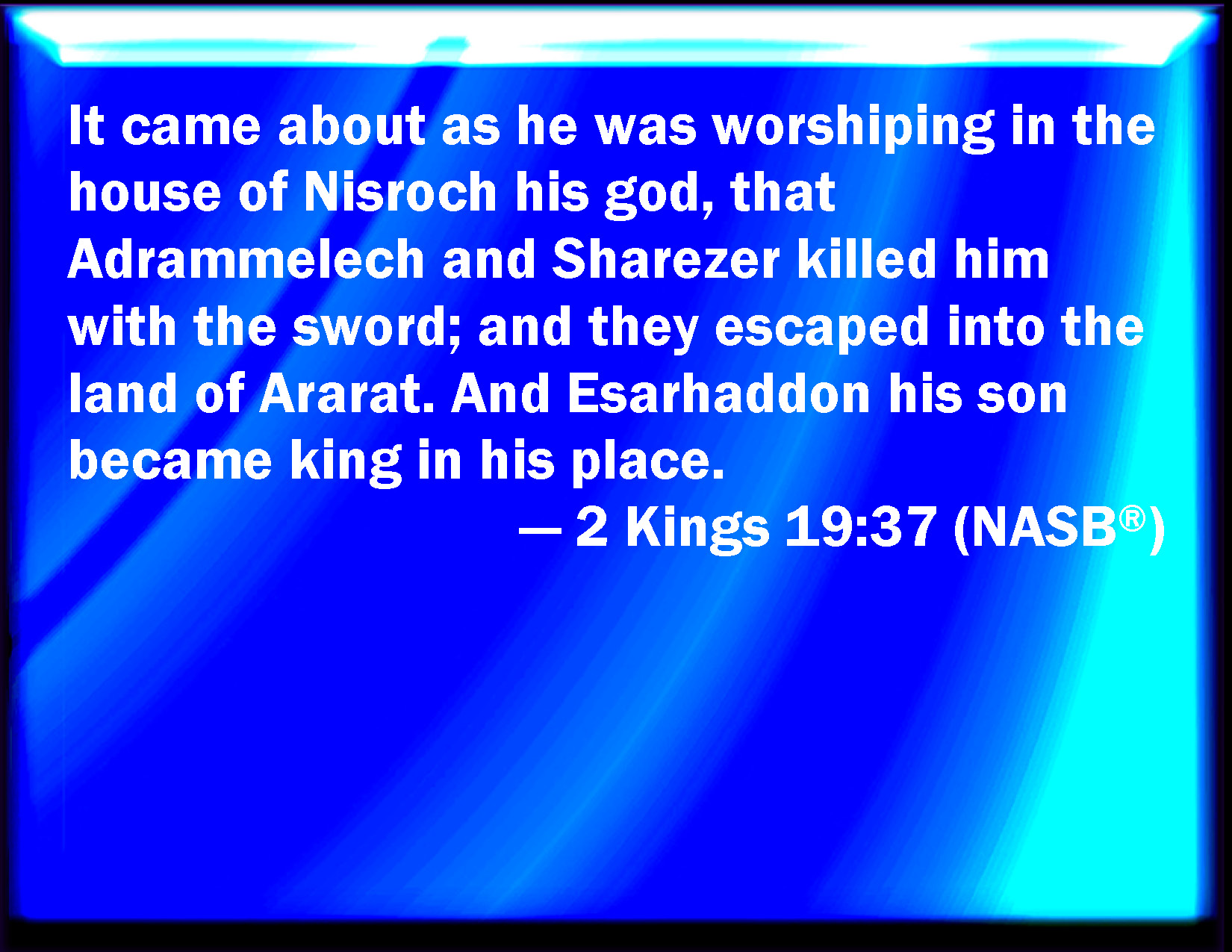 Bible Verse Slide 2 Kings 19:37 And it came to pass, as he was worshipping in the house of Nisroch his god, that Adrammelech and Sharezer his sons smote him with the sword: and they escaped into the land of Armenia. And Esarhaddon his son reigned in his stead. KJV: And it came to pass, as he was worshipping in the house of Nisroch his god, that Adrammelech and Sharezer his sons smote him with the sword: and they escaped into the land of Armenia. And Esarhaddon his son reigned in his stead. DRB: And as he was worshipping in the temple of Nesroch his god, Adramelech and Sarasar his sons slew him with the sword, and they fled into the land of the Armenians, and Asarhaddon his son reigned in his stead. DBT: And it came to pass, as he was worshipping in the house of Nisroch his god, that Adrammelech and Sharezer his sons smote him with the sword; and they escaped into the land of Ararat. And Esarhaddon his son reigned in his stead. ERV: And it came to pass, as he was worshipping in the house of Nisroch his god, that Adrammelech and Sharezer smote him with the sword: and they escaped into the land of Ararat. And Esar-haddon his son reigned in his stead. WBT: And it came to pass, as he was worshiping in the house of Nisroch his god, that Adrammelech and Sharezer his sons smote him with the sword: and they escaped into the land of Armenia. And Esar-haddon his son reigned in his stead. WEB: It happened, as he was worshipping in the house of Nisroch his god, that Adrammelech and Sharezer struck him with the sword; and they escaped into the land of Ararat. Esar Haddon his son reigned in his place. YLT: and it cometh to pass, he is bowing himself in the house of Nisroch his god, and Adramelech and Sharezar his sons have smitten him with the sword, and they have escaped to the land of Ararat, and Esar-Haddon his son reigneth in his stead.Links 2 Kings 19:37 NIV • 2 Kings 19:37 NLT • 2 Kings 19:37 ESV • 2 Kings 19:37 NASB • 2 Kings 19:37 KJV • 2 Kings 19:37 Interlinear • 2 Kings 19:37 Commentaries • 2 Kings 19:37 Parallel Texts • 2 Kings 19:37 Bible Apps • 2 Kings 19:37 Parallel • Bible Hub |