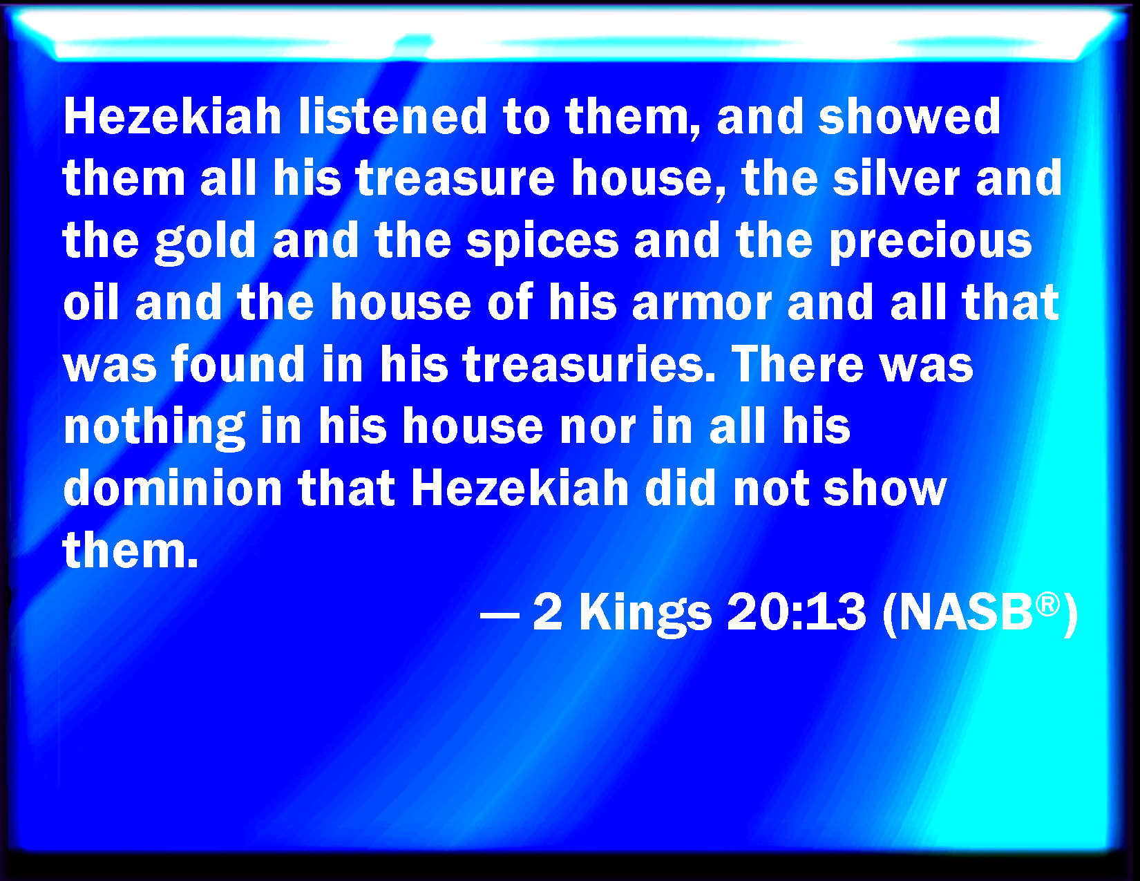 Bible Verse Slide 2 Kings 20:13 And Hezekiah listened to them, and showed them all the house of his precious things, the silver, and the gold, and the spices, and the precious ointment, and all the house of his armor, and all that was found in his treasures: there was nothing in his house, nor in all his dominion, that Hezekiah showed them not. KJV: And Hezekiah hearkened unto them, and shewed them all the house of his precious things, the silver, and the gold, and the spices, and the precious ointment, and all the house of his armour, and all that was found in his treasures: there was nothing in his house, nor in all his dominion, that Hezekiah shewed them not. DRB: And Ezechias rejoiced at their coming, and he showed them the house of his aromatical spices, and the gold and the silver, and divers precious odours, and ointments, and the house of his vessels, and all that he had in his treasures. There was nothing in his house, nor in all his dominions that Ezechias shewed them not. DBT: And Hezekiah hearkened to them, and shewed them all his treasure-house, the silver and the gold, and the spices and the fine oil, and all the house of his armour, and all that was found among his treasures: there was nothing in his house, nor in all his dominion, that Hezekiah did not shew them. ERV: And Hezekiah hearkened unto them, and shewed them all the house of his precious things, the silver, and the gold, and the spices, and the precious oil, and the house of his armour, and all that was found in his treasures: there was nothing in his house, nor in all his dominion that Hezekiah shewed them not. WBT: And Hezekiah hearkened to them, and showed them all the house of his precious things, the silver, and the gold, and the spices, and the precious ointment, and all the house of his armor, and all that was found in his treasures: there was nothing in his house, nor in all his dominion, that Hezekiah showed them not. WEB: Hezekiah listened to them, and showed them all the house of his precious things, the silver, and the gold, and the spices, and the precious oil, and the house of his armor, and all that was found in his treasures: there was nothing in his house, nor in all his dominion, that Hezekiah didn't show them. YLT: and Hezekiah hearkeneth unto them, and sheweth them all the house of his treasury, the silver, and the gold, and the spices, and the good ointment, and all the house of his vessels, and all that hath been found in his treasuries; there hath not been a thing that Hezekiah hath not shewed them, in his house, and in all his dominion.Links 2 Kings 20:13 NIV • 2 Kings 20:13 NLT • 2 Kings 20:13 ESV • 2 Kings 20:13 NASB • 2 Kings 20:13 KJV • 2 Kings 20:13 Interlinear • 2 Kings 20:13 Commentaries • 2 Kings 20:13 Parallel Texts • 2 Kings 20:13 Bible Apps • 2 Kings 20:13 Parallel • Bible Hub |