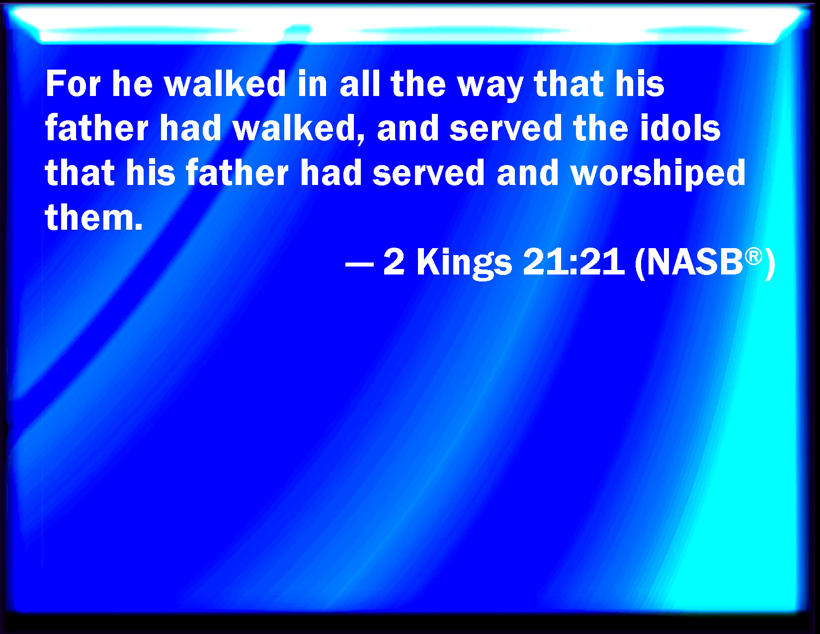Bible Verse Slide 2 Kings 21:21 And he walked in all the way that his father walked in, and served the idols that his father served, and worshipped them: KJV: And he walked in all the way that his father walked in, and served the idols that his father served, and worshipped them: DRB: And he walked in all the way in which his father had walked: and he served the abominations which his father had served, and he adored them; DBT: and he walked in all the way that his father had walked in, and served the idols that his father had served, and worshipped them; ERV: And he walked in all the way that his father walked in, and served the idols that his father served, and worshipped them: WBT: And he walked in all the way that his father walked in, and served the idols that his father served, and worshiped them: WEB: He walked in all the way that his father walked in, and served the idols that his father served, and worshiped them: YLT: and walketh in all the way that his father walked in, and serveth the idols that his father served, and boweth himself to them,Links 2 Kings 21:21 NIV • 2 Kings 21:21 NLT • 2 Kings 21:21 ESV • 2 Kings 21:21 NASB • 2 Kings 21:21 KJV • 2 Kings 21:21 Interlinear • 2 Kings 21:21 Commentaries • 2 Kings 21:21 Parallel Texts • 2 Kings 21:21 Bible Apps • 2 Kings 21:21 Parallel • Bible Hub |