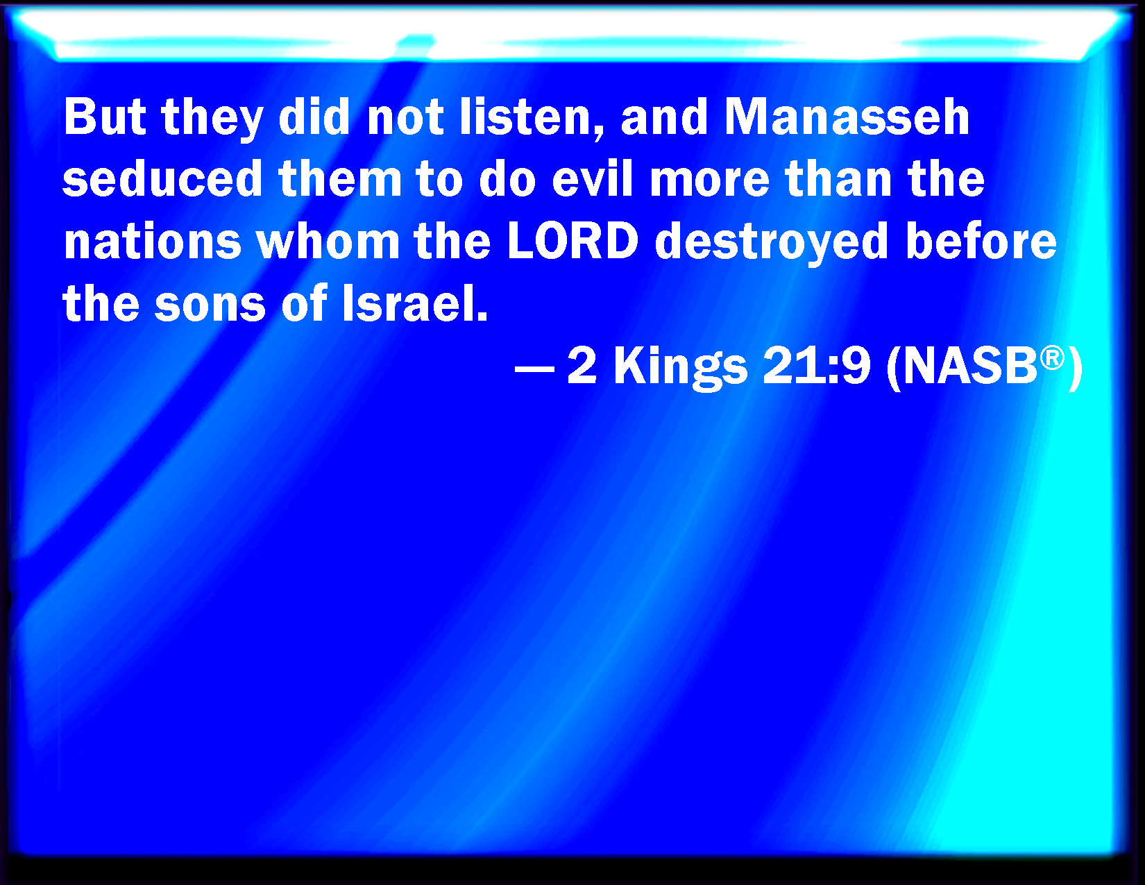 2 Kings 21:9 But they listened not: and Manasseh seduced them to do more evil than did the nations whom the LORD destroyed before the children of Israel.