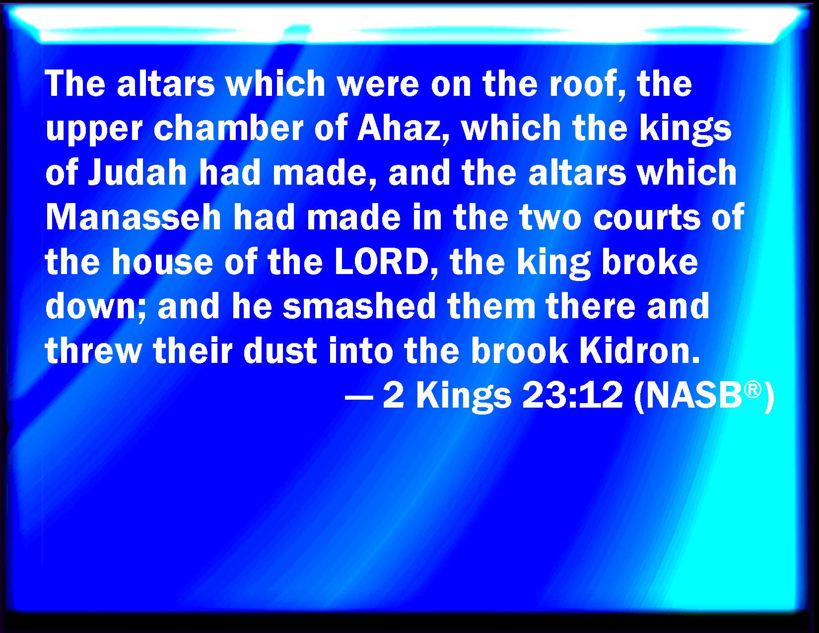 Bible Verse Slide 2 Kings 23:12 And the altars that were on the top of the upper chamber of Ahaz, which the kings of Judah had made, and the altars which Manasseh had made in the two courts of the house of the LORD, did the king beat down, and broke them down from there, and cast the dust of them into the brook Kidron. KJV: And the altars that were on the top of the upper chamber of Ahaz, which the kings of Judah had made, and the altars which Manasseh had made in the two courts of the house of the LORD, did the king beat down, and brake them down from thence, and cast the dust of them into the brook Kidron. DRB: And the altars that were upon the top of the upper chamber of Achaz, which the kings of Juda had made, and the altars which Manasses had made in the two courts of the temple of the Lord, the king broke down: and he ran from thence, and cast the ashes of them into the torrent Cedron. DBT: And the king broke down the altars that were on the roof of the upper chamber of Ahaz, which the kings of Judah had made, and the altars that Manasseh had made in the two courts of the house of Jehovah, and he shattered them, removing them from thence, and cast the powder of them into the torrent of Kidron. ERV: And the altars that were on the roof of the upper chamber of Ahaz, which the kings of Judah had made, and the altars which Manasseh had made in the two courts of the house of the LORD, did the king break down, and beat them down from thence, and cast the dust of them into the brook Kidron. WBT: And the altars that were on the top of the upper chamber of Ahaz, which the kings of Judah had made, and the altars which Manasseh had made in the two courts of the house of the LORD, did the king beat down, and broke them down from thence, and cast the dust of them into the brook Kidron. WEB: The altars that were on the roof of the upper room of Ahaz, which the kings of Judah had made, and the altars which Manasseh had made in the two courts of the house of Yahweh, did the king break down, and beat [them] down from there, and cast the dust of them into the brook Kidron. YLT: And the altars that are on the top of the upper chamber of Ahaz, that the kings of Judah made, and the altars that Manasseh made in the two courts of the house of Jehovah, hath the king broken down, and removeth thence, and hath cast their dust unto the brook Kidron.Links 2 Kings 23:12 NIV • 2 Kings 23:12 NLT • 2 Kings 23:12 ESV • 2 Kings 23:12 NASB • 2 Kings 23:12 KJV • 2 Kings 23:12 Interlinear • 2 Kings 23:12 Commentaries • 2 Kings 23:12 Parallel Texts • 2 Kings 23:12 Bible Apps • 2 Kings 23:12 Parallel • Bible Hub |