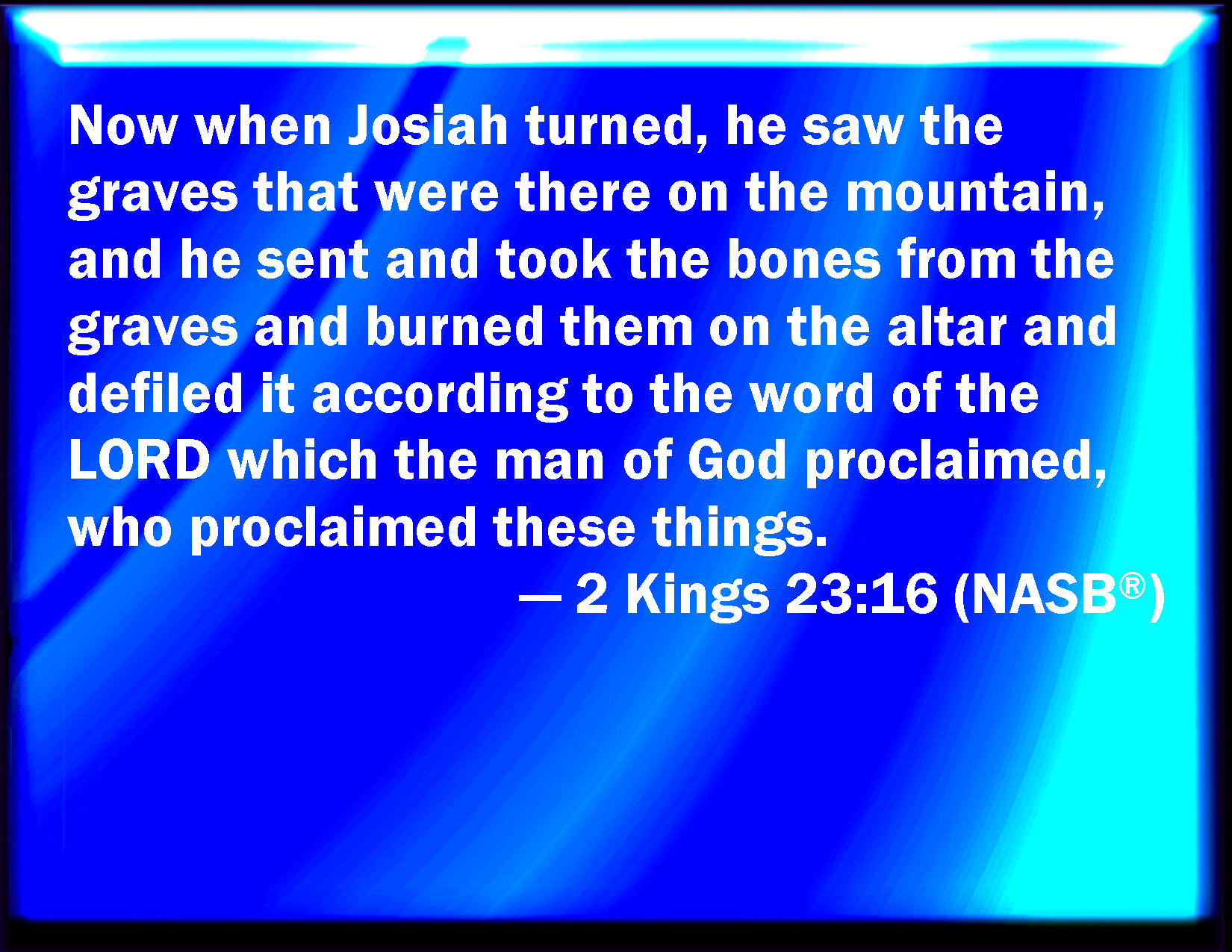 Bible Verse Slide 2 Kings 23:16 And as Josiah turned himself, he spied the sepulchers that were there in the mount, and sent, and took the bones out of the sepulchers, and burned them on the altar, and polluted it, according to the word of the LORD which the man of God proclaimed, who proclaimed these words. KJV: And as Josiah turned himself, he spied the sepulchres that were there in the mount, and sent, and took the bones out of the sepulchres, and burned them upon the altar, and polluted it, according to the word of the LORD which the man of God proclaimed, who proclaimed these words. DRB: And as Josias turned himself, he saw there the sepulchres that were in the mount: and he sent and took the bones out of the sepulchres, and burnt them upon the altar, and defiled it according to the word of the Lord, which the man of God spoke, who had foretold these things. DBT: And Josiah turned himself, and saw the sepulchres that were there on the mount; and he sent and took the bones out of the sepulchres, and burned them upon the altar, and defiled it, according to the word of Jehovah, that the man of God had proclaimed, who proclaimed these things. ERV: And as Josiah turned himself, he spied the sepulchres that were there in the mount; and he sent, and took the bones out of the sepulchres, and burned them upon the altar, and defiled it, according to the word of the LORD which the man of God proclaimed, who proclaimed these things. WBT: And as Josiah turned himself, he espied the sepulchers that were there on the mount, and sent, and took the bones out of the sepulchers, and burned them upon the altar, and polluted it, according to the word of the LORD which the man of God proclaimed, who proclaimed these words. WEB: As Josiah turned himself, he spied the tombs that were there in the mountain; and he sent, and took the bones out of the tombs, and burned them on the altar, and defiled it, according to the word of Yahweh which the man of God proclaimed, who proclaimed these things. YLT: And Josiah turneth, and seeth the graves that are there in the mount, and sendeth and taketh the bones out of the graves, and burneth them on the altar, and defileth it, according to the word of Jehovah that the man of God proclaimed, who proclaimed these things.Links 2 Kings 23:16 NIV • 2 Kings 23:16 NLT • 2 Kings 23:16 ESV • 2 Kings 23:16 NASB • 2 Kings 23:16 KJV • 2 Kings 23:16 Interlinear • 2 Kings 23:16 Commentaries • 2 Kings 23:16 Parallel Texts • 2 Kings 23:16 Bible Apps • 2 Kings 23:16 Parallel • Bible Hub |