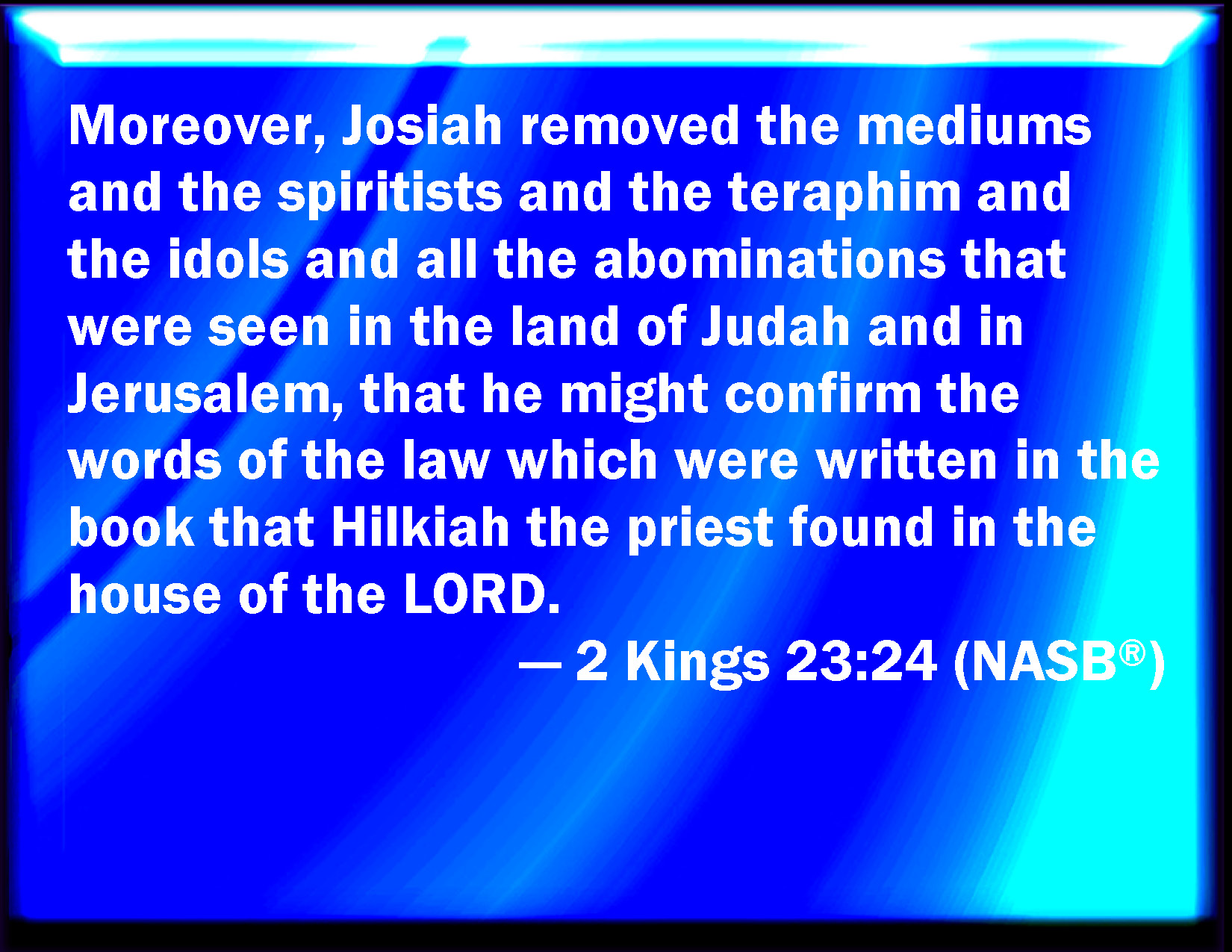 Bible Verse Slide 2 Kings 23:24 Moreover the workers with familiar spirits, and the wizards, and the images, and the idols, and all the abominations that were spied in the land of Judah and in Jerusalem, did Josiah put away, that he might perform the words of the law which were written in the book that Hilkiah the priest found in the house of the LORD. KJV: Moreover the workers with familiar spirits, and the wizards, and the images, and the idols, and all the abominations that were spied in the land of Judah and in Jerusalem, did Josiah put away, that he might perform the words of the law which were written in the book that Hilkiah the priest found in the house of the LORD. DRB: Moreover the diviners by spirits, and soothsayers, and the figures of idols, and the uncleannesses, and the abominations, that had been in the land of Juda, and Jerusalem, Josias took away: that he might perform the words of the law, that were written in the book which Helcias the priest had found in the temple of the Lord. DBT: Moreover the necromancers and the soothsayers, and the teraphim and the idols, and all the abominations that were seen in the land of Judah and in Jerusalem, Josiah took away, that he might perform the words of the law which were written in the book that Hilkijah the priest had found in the house of Jehovah. ERV: Moreover them that had familiar spirits, and the wizards, and the teraphim, and the idols, and all the abominations that were spied in the land of Judah and in Jerusalem, did Josiah put away, that he might confirm the words of the law which were written in the book that Hilkiah the priest found in the house of the LORD. WBT: Moreover the workers with familiar spirits, and the wizards, and the images, and the idols, and all the abominations that were seen in the land of Judah and in Jerusalem, did Josiah put away, that he might perform the words of the law which were written in the book that Hilkiah the priest found in the house of the LORD. WEB: Moreover those who had familiar spirits, and the wizards, and the teraphim, and the idols, and all the abominations that were seen in the land of Judah and in Jerusalem, did Josiah put away, that he might confirm the words of the law which were written in the book that Hilkiah the priest found in the house of Yahweh. YLT: And also, those having familiar spirits, and the wizards, and the teraphim, and the idols, and all the abominations that were seen in the land of Judah, and in Jerusalem, hath Josiah put away, in order to establish the words of the law that are written on the book that Hilkiah the priest hath found in the house of Jehovah.Links 2 Kings 23:24 NIV • 2 Kings 23:24 NLT • 2 Kings 23:24 ESV • 2 Kings 23:24 NASB • 2 Kings 23:24 KJV • 2 Kings 23:24 Interlinear • 2 Kings 23:24 Commentaries • 2 Kings 23:24 Parallel Texts • 2 Kings 23:24 Bible Apps • 2 Kings 23:24 Parallel • Bible Hub |