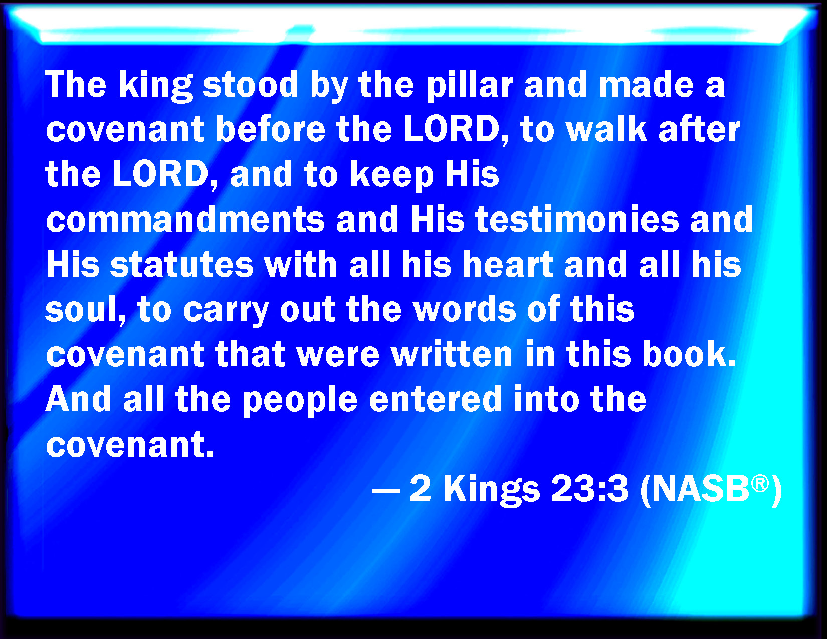 Bible Verse Slide 2 Kings 23:3 And the king stood by a pillar, and made a covenant before the LORD, to walk after the LORD, and to keep his commandments and his testimonies and his statutes with all their heart and all their soul, to perform the words of this covenant that were written in this book. And all the people stood to the covenant. KJV: And the king stood by a pillar, and made a covenant before the LORD, to walk after the LORD, and to keep his commandments and his testimonies and his statutes with all their heart and all their soul, to perform the words of this covenant that were written in this book. And all the people stood to the covenant. DRB: And the king stood upon the step: and made a covenant with the Lord, to walk after the Lord, and to keep his commandments, and his testimonies and his ceremonies, with all their heart, and with all their soul, and to perform the words of this covenant, which were written in that book: and the people agreed to the covenant. DBT: And the king stood on the dais, and made a covenant before Jehovah, to walk after Jehovah, and to keep his commandments and his testimonies and his statutes with all his heart, and with all his soul, to establish the words of this covenant that are written in this book. And all the people stood to the covenant. ERV: And the king stood by the pillar, and made a covenant before the LORD, to walk after the LORD, and to keep his commandments, and his testimonies, and his statutes, with all his heart, and all his soul, to confirm the words of this covenant that were written in this book: and all the people stood to the covenant. WBT: And the king stood by a pillar, and made a covenant before the LORD, to walk after the LORD, and to keep his commandments, and his testimonies, and his statutes, with all their heart and all their soul, to perform the words of this covenant that were written in this book. And all the people stood to the covenant. WEB: The king stood by the pillar, and made a covenant before Yahweh, to walk after Yahweh, and to keep his commandments, and his testimonies, and his statutes, with all [his] heart, and all [his] soul, to confirm the words of this covenant that were written in this book: and all the people stood to the covenant. YLT: And the king standeth by the pillar, and maketh the covenant before Jehovah, to walk after Jehovah, and to keep His commands, and His testimonies, and His statutes, with all the heart, and with all the soul, to establish the words of this covenant that are written on this book, and all the people stand in the covenant.Links 2 Kings 23:3 NIV • 2 Kings 23:3 NLT • 2 Kings 23:3 ESV • 2 Kings 23:3 NASB • 2 Kings 23:3 KJV • 2 Kings 23:3 Interlinear • 2 Kings 23:3 Commentaries • 2 Kings 23:3 Parallel Texts • 2 Kings 23:3 Bible Apps • 2 Kings 23:3 Parallel • Bible Hub |