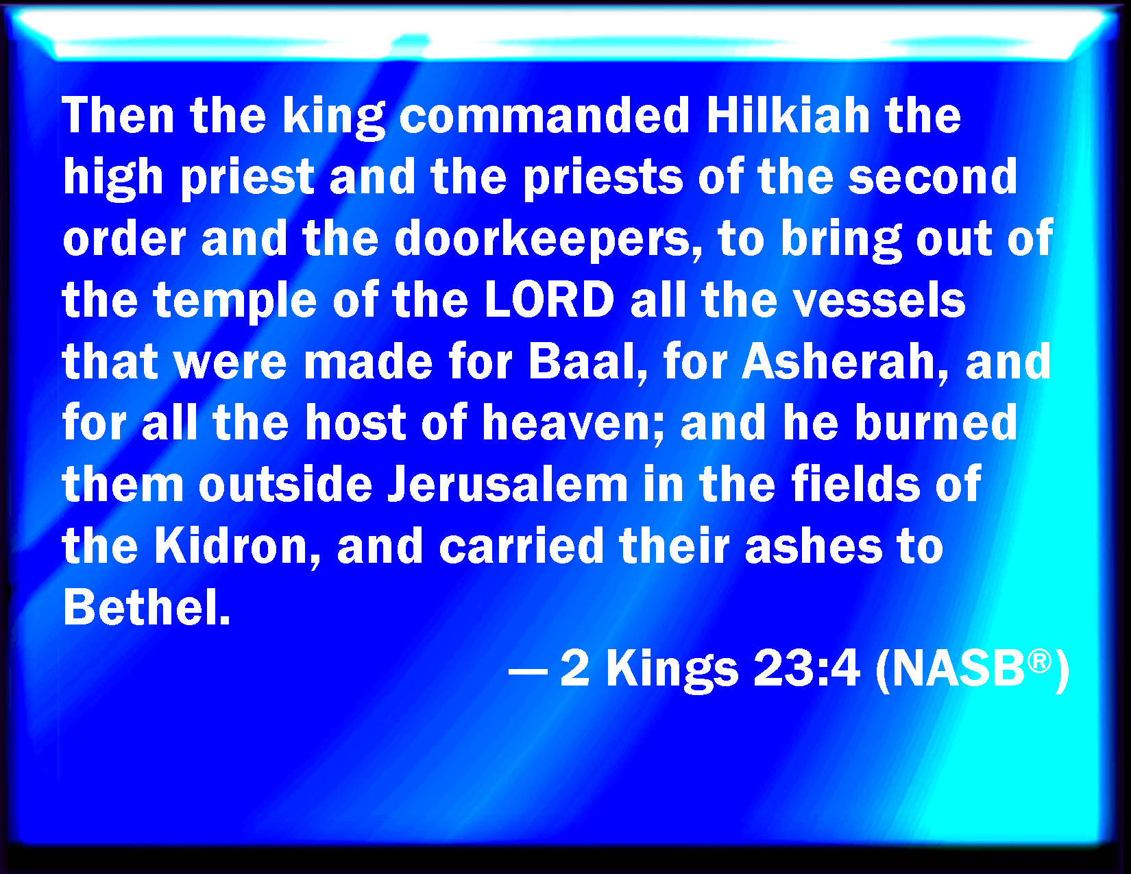 Bible Verse Slide 2 Kings 23:4 And the king commanded Hilkiah the high priest, and the priests of the second order, and the keepers of the door, to bring forth out of the temple of the LORD all the vessels that were made for Baal, and for the grove, and for all the host of heaven: and he burned them without Jerusalem in the fields of Kidron, and carried the ashes of them to Bethel. KJV: And the king commanded Hilkiah the high priest, and the priests of the second order, and the keepers of the door, to bring forth out of the temple of the LORD all the vessels that were made for Baal, and for the grove, and for all the host of heaven: and he burned them without Jerusalem in the fields of Kidron, and carried the ashes of them unto Bethel. DRB: And the king commanded Helcias the high priest, and the priests of the second order, and the doorkeepers, to cast out of the temple of the Lord all the vessels that had been made for Baal, and for the grove, and for all the host of heaven: and he burnt them without Jerusalem in the valley of Cedron, and he carried the ashes of them to Bethel. DBT: And the king commanded Hilkijah the high priest, and the priests of the second order, and the doorkeepers, to bring forth out of the temple of Jehovah all the vessels that had been made for Baal, and for the Asherah, and for all the host of the heavens; and he burned them outside Jerusalem in the fields of Kidron, and carried the ashes of them to Bethel. ERV: And the king commanded Hilkiah the high priest, and the priests of the second order, and the keepers of the door, to bring forth out of the temple of the LORD all the vessels that were made for Baal, and for the Asherah, and for all the host of heaven: and he burned them without Jerusalem in the fields of Kidron, and carried the ashes of them unto Beth-el. WBT: And the king commanded Hilkiah the high priest, and the priests of the second order, and the keepers of the door, to bring forth out of the temple of the LORD all the vessels that were made for Baal, and for the grove, and for all the host of heaven: and he burned them without Jerusalem in the fields of Kidron, and carried the ashes of them to Beth-el. WEB: The king commanded Hilkiah the high priest, and the priests of the second order, and the keepers of the threshold, to bring forth out of the temple of Yahweh all the vessels that were made for Baal, and for the Asherah, and for all the army of the sky, and he burned them outside of Jerusalem in the fields of the Kidron, and carried the ashes of them to Bethel. YLT: And the king commandeth Hilkiah the high priest, and the priests of the second order, and the keepers of the threshold, to bring out from the temple of Jehovah all the vessels that are made for Baal, and for the shrine, and for all the host of the heavens, and he burneth them at the outside of Jerusalem, in the fields of Kidron, and hath borne their ashes to Beth-El.Links 2 Kings 23:4 NIV • 2 Kings 23:4 NLT • 2 Kings 23:4 ESV • 2 Kings 23:4 NASB • 2 Kings 23:4 KJV • 2 Kings 23:4 Interlinear • 2 Kings 23:4 Commentaries • 2 Kings 23:4 Parallel Texts • 2 Kings 23:4 Bible Apps • 2 Kings 23:4 Parallel • Bible Hub |