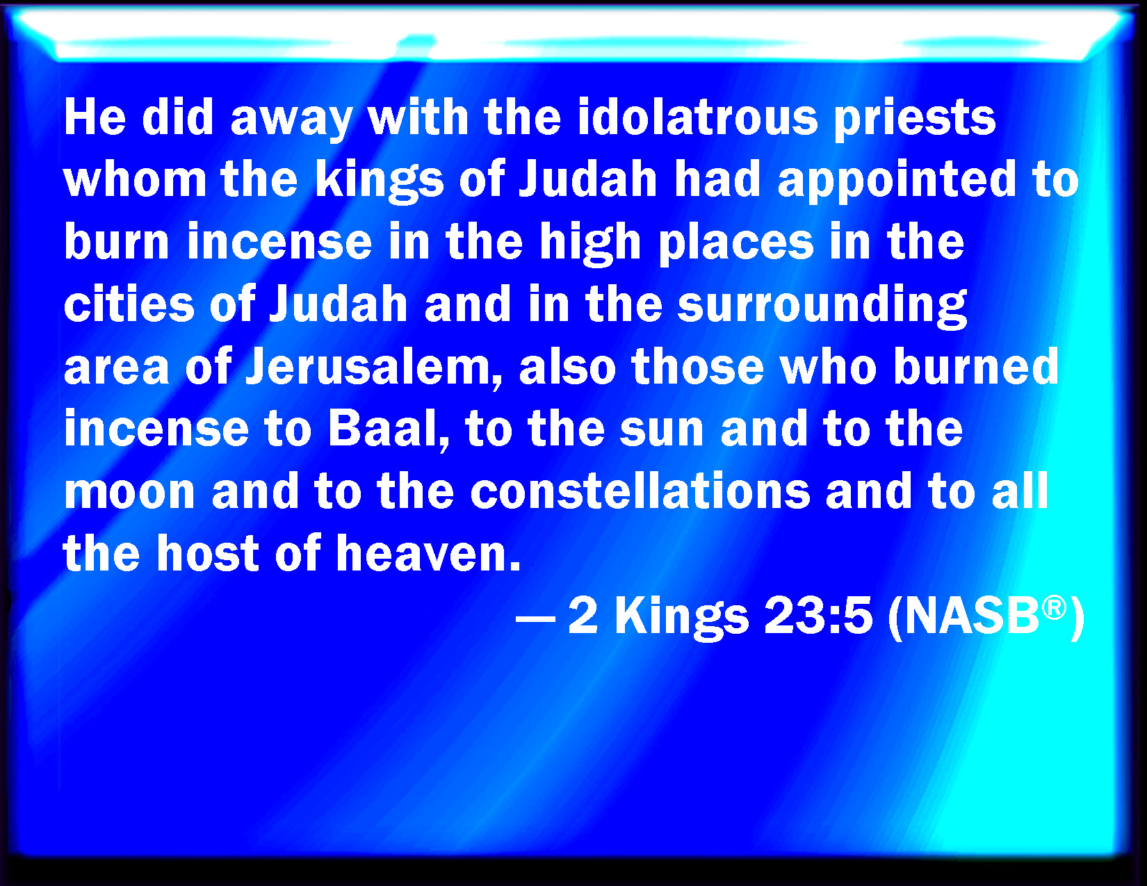 Bible Verse Slide 2 Kings 23:5 And he put down the idolatrous priests, whom the kings of Judah had ordained to burn incense in the high places in the cities of Judah, and in the places round about Jerusalem; them also that burned incense to Baal, to the sun, and to the moon, and to the planets, and to all the host of heaven. KJV: And he put down the idolatrous priests, whom the kings of Judah had ordained to burn incense in the high places in the cities of Judah, and in the places round about Jerusalem; them also that burned incense unto Baal, to the sun, and to the moon, and to the planets, and to all the host of heaven. DRB: And he destroyed the soothsayers, whom the kings of Juda had appointed to sacrifice in the high places in the cities of Juda, and round about Jerusalem: them also that burnt incense to Baal, and to the sun, and to the moon, and to the twelve signs, and to all the host of heaven. DBT: And he abolished the idolatrous priests, whom the kings of Judah had ordained to burn incense on the high places in the cities of Judah, and the environs of Jerusalem; and them that burned incense to Baal, to the sun, and to the moon, and to the constellations, and to all the host of heaven. ERV: And he put down the idolatrous priests, whom the kings of Judah had ordained to burn incense in the high places in the cities of Judah, and in the places round about Jerusalem; them also that burned incense unto Baal, to the sun, and to the moon, and to the planets, and to all the host of heaven. WBT: And he put down the idolatrous priests, whom the kings of Judah had ordained to burn incense in the high places in the cities of Judah, and in the places around Jerusalem; them also that burned incense to Baal, to the sun, and to the moon, and to the planets, and to all the host of heaven. WEB: He put down the idolatrous priests, whom the kings of Judah had ordained to burn incense in the high places in the cities of Judah, and in the places around Jerusalem; those also who burned incense to Baal, to the sun, and to the moon, and to the planets, and to all the army of the sky. YLT: And he hath caused to cease the idolatrous priests whom the kings of Judah have appointed, (and they make perfume in high places, in cities of Judah and suburbs of Jerusalem,) and those making perfume to Baal, to the sun, and to the moon, and to the planets, and to all the host of the heavens.Links 2 Kings 23:5 NIV • 2 Kings 23:5 NLT • 2 Kings 23:5 ESV • 2 Kings 23:5 NASB • 2 Kings 23:5 KJV • 2 Kings 23:5 Interlinear • 2 Kings 23:5 Commentaries • 2 Kings 23:5 Parallel Texts • 2 Kings 23:5 Bible Apps • 2 Kings 23:5 Parallel • Bible Hub |