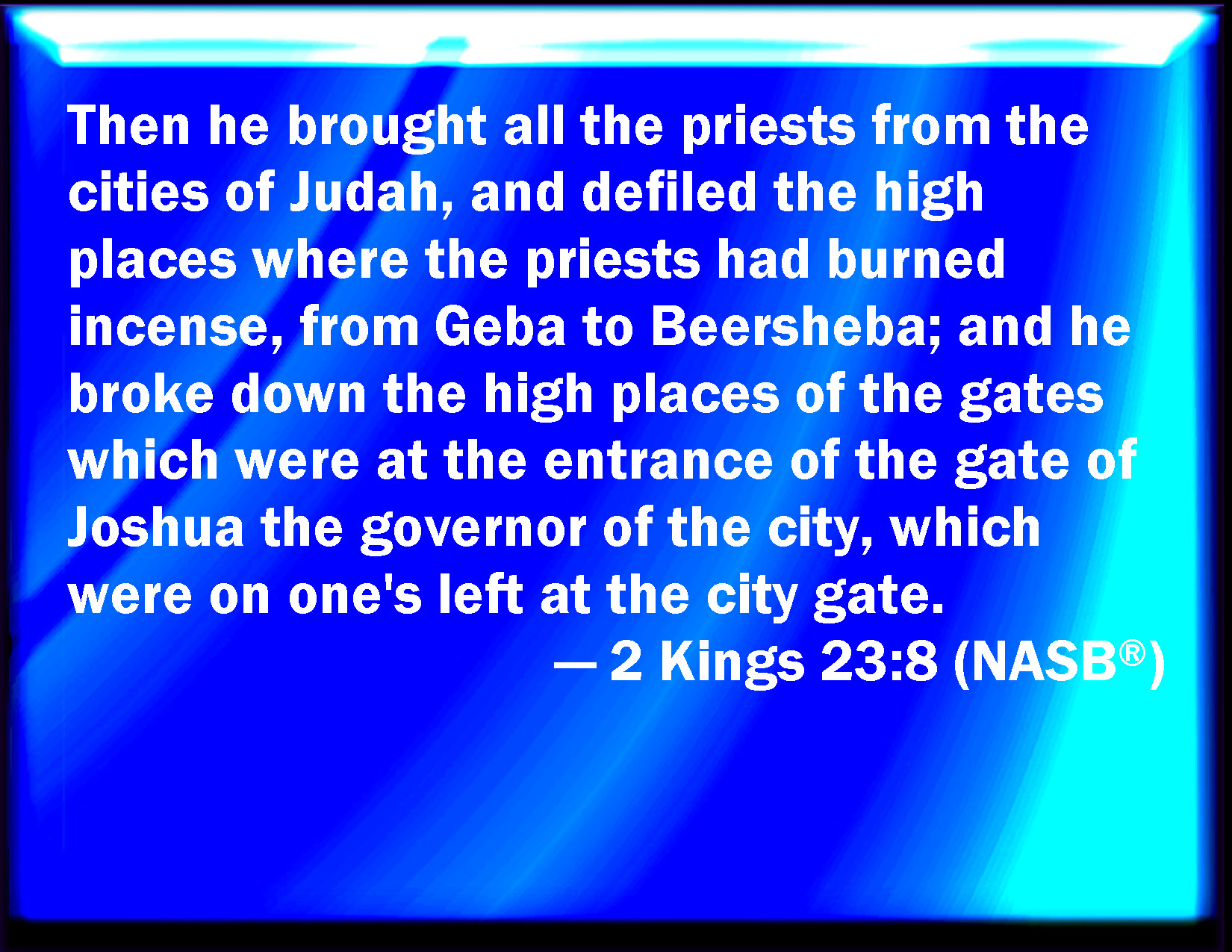 And he brought all the priests out of the cities of Judah, and defiled the high places where the priests had burned incense, from Geba even to Beer-sheba; and he broke down the high places of the gates, those at the entrance of the gate of Joshua the governor of the city, and those on the left hand of any going in at the gate of the city.