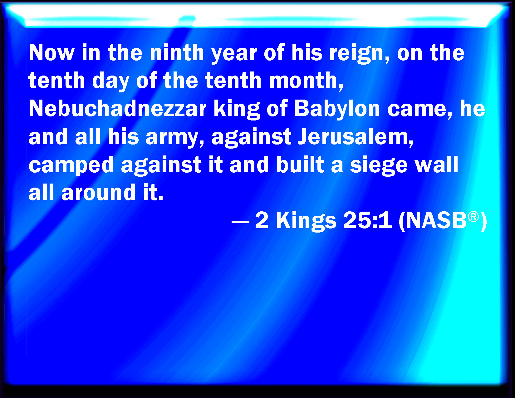 Bible Verse Slide 2 Kings 25:1 And it came to pass in the ninth year of his reign, in the tenth month, in the tenth day of the month, that Nebuchadnezzar king of Babylon came, he, and all his host, against Jerusalem, and pitched against it; and they built forts against it round about. KJV: And it came to pass in the ninth year of his reign, in the tenth month, in the tenth day of the month, that Nebuchadnezzar king of Babylon came, he, and all his host, against Jerusalem, and pitched against it; and they built forts against it round about. DRB: And it came to pass in the ninth year of his reign, in the tenth month, the tenth day of the month, that Nabuchodonosor king of Babylon came, he and all his army against Jerusalem: and they surrounded it: end raised works round about it. DBT: And it came to pass in the ninth year of his reign, in the tenth month, on the tenth of the month, that Nebuchadnezzar king of Babylon came, he and all his army, against Jerusalem, and encamped against it; and they built turrets against it round about. ERV: And it came to pass in the ninth year of his reign, in the tenth month, in the tenth day of the month, that Nebuchadnezzar king of Babylon came, he and all his army, against Jerusalem, and encamped against it; and they built forts against it round about. WBT: And it came to pass in the ninth year of his reign, in the tenth month, in the tenth day of the month, that Nebuchadnezzar king of Babylon came, he, and all his army, against Jerusalem, and encamped against it; and they built forts against it on all sides. WEB: It happened in the ninth year of his reign, in the tenth month, in the tenth day of the month, that Nebuchadnezzar king of Babylon came, he and all his army, against Jerusalem, and encamped against it; and they built forts against it around it. YLT: And it cometh to pass, in the ninth year of his reign, in the tenth month, in the tenth of the month, come hath Nebuchadnezzar king of Babylon, he and all his force, against Jerusalem, and encampeth against it, and buildeth against it a fortification round about.Links 2 Kings 25:1 NIV • 2 Kings 25:1 NLT • 2 Kings 25:1 ESV • 2 Kings 25:1 NASB • 2 Kings 25:1 KJV • 2 Kings 25:1 Interlinear • 2 Kings 25:1 Commentaries • 2 Kings 25:1 Parallel Texts • 2 Kings 25:1 Bible Apps • 2 Kings 25:1 Parallel • Bible Hub |