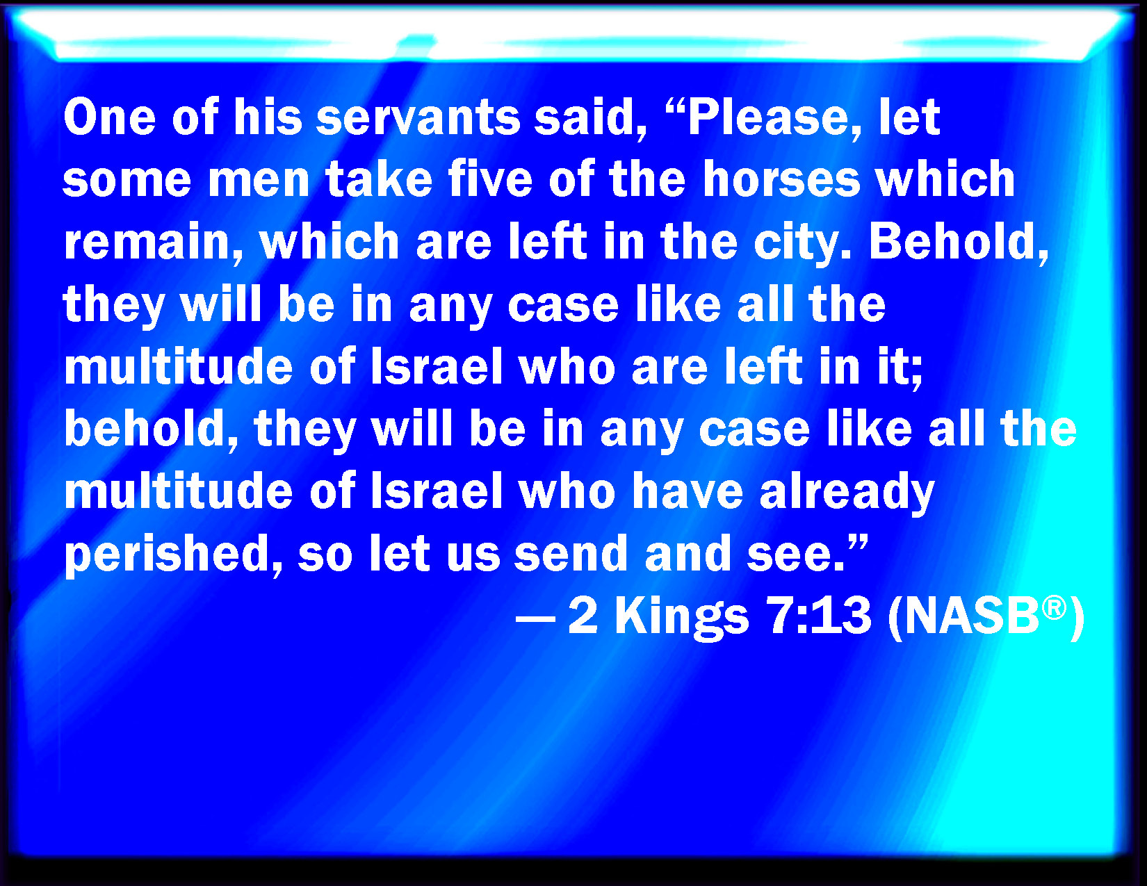 Bible Verse Slide 2 Kings 7:13 And one of his servants answered and said, Let some take, I pray you, five of the horses that remain, which are left in the city, (behold, they are as all the multitude of Israel that are left in it: behold, I say, they are even as all the multitude of the Israelites that are consumed:) and let us send and see. KJV: And one of his servants answered and said, Let some take, I pray thee, five of the horses that remain, which are left in the city, (behold, they are as all the multitude of Israel that are left in it: behold, I say, they are even as all the multitude of the Israelites that are consumed:) and let us send and see. DRB: And one of his servants answered: Let us take the five horses that are remaining in the city (because there are no more in the whole multitude of Israel, for the rest are consumed,) and let us send and see. DBT: And one of his servants answered and said, Let some one take, I pray thee, five of the horses that remain, which are left in the city (behold, they are as all the multitude of Israel that are left in it: behold, they are even as all the multitude of the Israelites that have perished), and let us send and see. ERV: And one of his servants answered and said, Let some take, I pray thee, five of the horses that remain, which are left in the city, (behold, they are as all the multitude of Israel that are left in it; behold, they are as all the multitude of Israel that are consumed:) and let us send and see. WBT: And one of his servants answered and said, Let some take, I pray thee, five of the horses that remain, which are left in the city, (behold, they are as all the multitude of Israel that are left in it: behold, I say, they are even as all the multitude of the Israelites that are consumed:) and let us send and see. WEB: One of his servants answered, "Please let some take five of the horses that remain, which are left in the city. Behold, they are like all the multitude of Israel who are left in it. Behold, they are like all the multitude of Israel who are consumed. Let us send and see." YLT: And one of his servants answereth and saith, 'Then let them take, I pray thee, five of the horses that are left, that have been left in it — lo, they are as all the multitude of Israel who have been left in it; lo, they are as all the multitude of Israel who have been consumed — and we send and see.'Links 2 Kings 7:13 NIV • 2 Kings 7:13 NLT • 2 Kings 7:13 ESV • 2 Kings 7:13 NASB • 2 Kings 7:13 KJV • 2 Kings 7:13 Interlinear • 2 Kings 7:13 Commentaries • 2 Kings 7:13 Parallel Texts • 2 Kings 7:13 Bible Apps • 2 Kings 7:13 Parallel • Bible Hub |