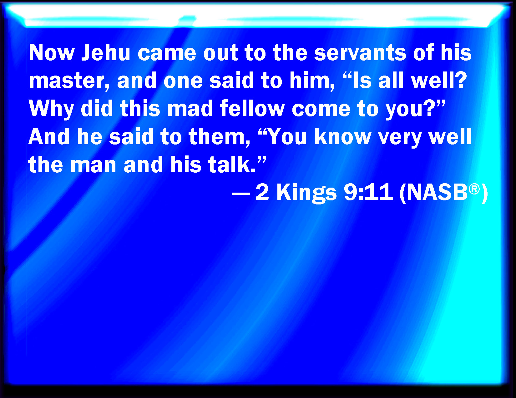 Bible Verse Slide 2 Kings 9:11 Then Jehu came forth to the servants of his lord: and one said to him, Is all well? why came this mad fellow to you? And he said to them, You know the man, and his communication. KJV: Then Jehu came forth to the servants of his lord: and one said unto him, Is all well? wherefore came this mad fellow to thee? And he said unto them, Ye know the man, and his communication. DRB: Then Jehu went forth to the servants of his lord: and they said to him: Are all things well? why came this mad man to thee? And he said to them: You know the man, and what he said. DBT: And Jehu came forth to the servants of his lord. And one said to him, Is all well? why came this madman to thee? And he said to them, Ye know the man, and his mind. ERV: Then Jehu came forth to the servants of his lord: and one said unto him, Is all well? wherefore came this mad fellow to thee? And he said unto them, Ye know the man and what his talk was. WBT: Then Jehu came forth to the servants of his lord: and one said to him, Is all well? Why came this mad man to thee? And he said to them, Ye know the man, and his communication. WEB: Then Jehu came forth to the servants of his lord: and one said to him, "Is all well? Why did this mad fellow come to you?" He said to them, "You know the man and what his talk was." YLT: And Jehu hath gone out unto the servants of his lord, and one saith to him, 'Is there peace? wherefore came this madman unto thee?' and he saith unto them, 'Ye have known the man and his talk.'Links 2 Kings 9:11 NIV • 2 Kings 9:11 NLT • 2 Kings 9:11 ESV • 2 Kings 9:11 NASB • 2 Kings 9:11 KJV • 2 Kings 9:11 Interlinear • 2 Kings 9:11 Commentaries • 2 Kings 9:11 Parallel Texts • 2 Kings 9:11 Bible Apps • 2 Kings 9:11 Parallel • Bible Hub |