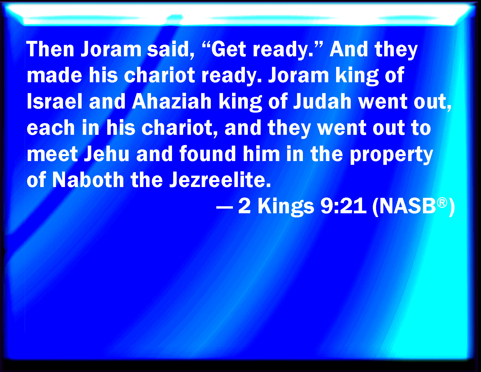 Bible Verse Slide 2 Kings 9:21 And Joram said, Make ready. And his chariot was made ready. And Joram king of Israel and Ahaziah king of Judah went out, each in his chariot, and they went out against Jehu, and met him in the portion of Naboth the Jezreelite. KJV: And Joram said, Make ready. And his chariot was made ready. And Joram king of Israel and Ahaziah king of Judah went out, each in his chariot, and they went out against Jehu, and met him in the portion of Naboth the Jezreelite. DRB: And Joram said: Make ready the chariot. And they made ready his chariot, and Joram king of Israel, and Ochozias king of Juda went out, each in his chariot, and they went out to meet Jehu, and met him in the field of Naboth the Jezrahelite. DBT: Then Joram said, Make ready! And they made ready his chariot. And Joram king of Israel and Ahaziah king of Judah went out, each in his chariot; and they went out to meet Jehu, and met him in the plot of Naboth the Jizreelite. ERV: And Joram said, Make ready. And they made ready his chariot. And Joram king of Israel and Ahaziah king of Judah went out, each in his chariot, and they went out to meet Jehu, and found him in the portion of Naboth the Jezreelite. WBT: And Joram said, Make ready. And his chariot was made ready. And Joram king of Israel and Ahaziah king of Judah went out, each in his chariot, and they went out against Jehu, and met him in the portion of Naboth the Jezreelite. WEB: Joram said, "Get ready!" They got his chariot ready. Joram king of Israel and Ahaziah king of Judah went out, each in his chariot, and they went out to meet Jehu, and found him in the portion of Naboth the Jezreelite. YLT: And Jehoram saith, 'Harness;' and his chariot is harnessed, and Jehoram king of Israel goeth out, and Ahaziah king of Judah, each in his chariot, and they go out to meet Jehu, and find him in the portion of Naboth the Jezreelite.Links 2 Kings 9:21 NIV • 2 Kings 9:21 NLT • 2 Kings 9:21 ESV • 2 Kings 9:21 NASB • 2 Kings 9:21 KJV • 2 Kings 9:21 Interlinear • 2 Kings 9:21 Commentaries • 2 Kings 9:21 Parallel Texts • 2 Kings 9:21 Bible Apps • 2 Kings 9:21 Parallel • Bible Hub |