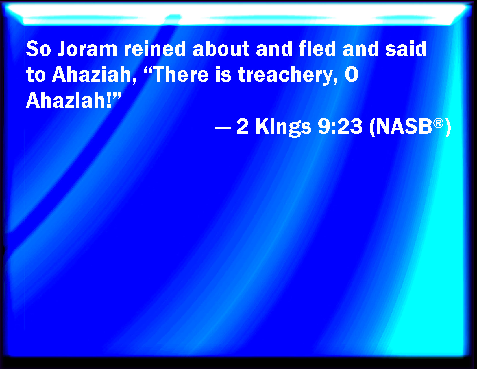 Bible Verse Slide 2 Kings 9:23 And Joram turned his hands, and fled, and said to Ahaziah, There is treachery, O Ahaziah. KJV: And Joram turned his hands, and fled, and said to Ahaziah, There is treachery, O Ahaziah. DRB: And Joram turned his hand, and fleeing, said to Ochozias: There is treachery, Ochozias. DBT: Then Joram turned his hand, and fled, and said to Ahaziah, Treachery, Ahaziah! ERV: And Joram turned his hands, and fled, and said to Ahaziah, There is treachery, O Ahaziah. WBT: And Joram turned his hands, and fled, and said to Ahaziah, There is treachery, O Ahaziah. WEB: Joram turned his hands, and fled, and said to Ahaziah, "There is treason, Ahaziah!" YLT: And Jehoram turneth his hands, and fleeth, and saith unto Ahaziah, 'Deceit, O Ahaziah!'Links 2 Kings 9:23 NIV • 2 Kings 9:23 NLT • 2 Kings 9:23 ESV • 2 Kings 9:23 NASB • 2 Kings 9:23 KJV • 2 Kings 9:23 Interlinear • 2 Kings 9:23 Commentaries • 2 Kings 9:23 Parallel Texts • 2 Kings 9:23 Bible Apps • 2 Kings 9:23 Parallel • Bible Hub |