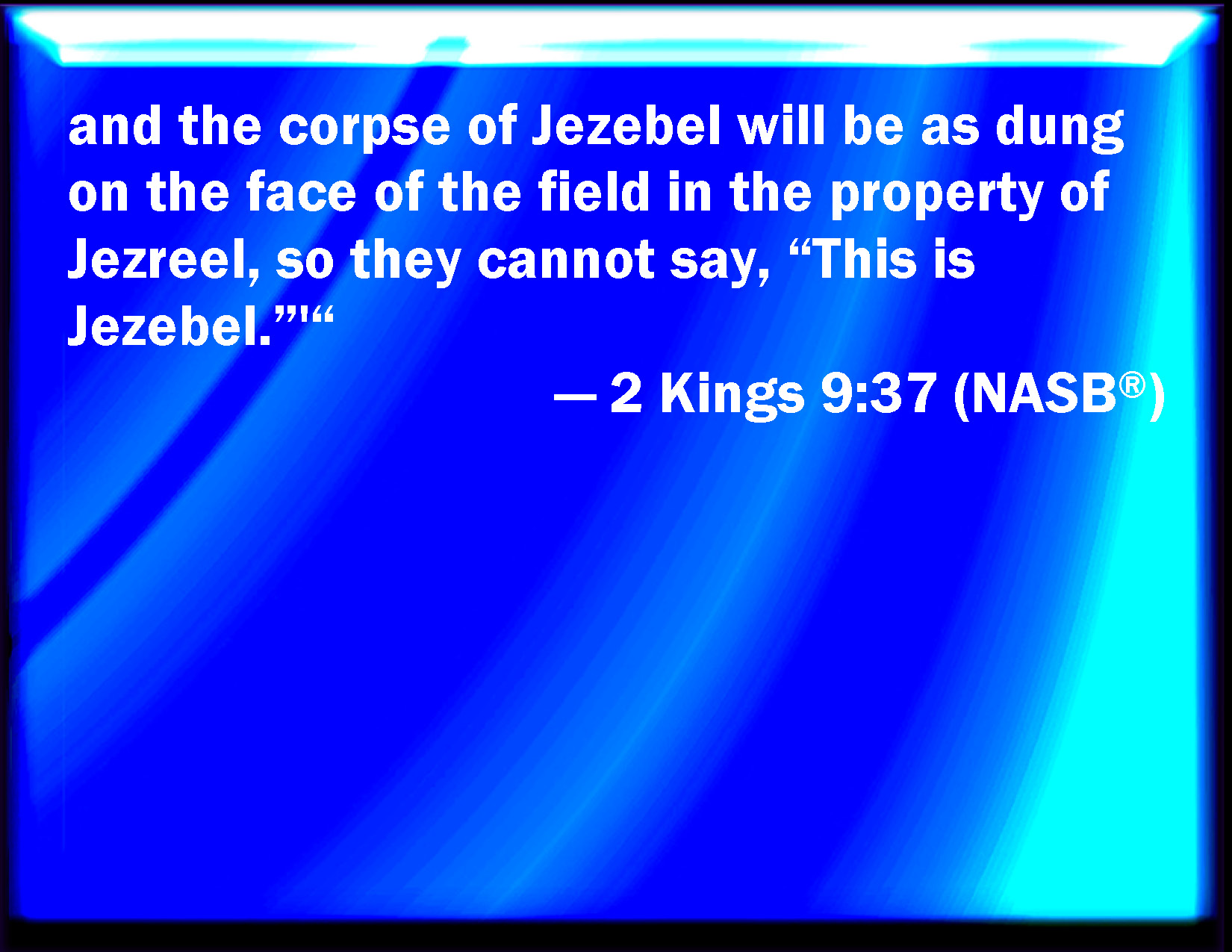 Bible Verse Slide 2 Kings 9:37 And the carcass of Jezebel shall be as dung on the face of the field in the portion of Jezreel; so that they shall not say, This is Jezebel. KJV: And the carcase of Jezebel shall be as dung upon the face of the field in the portion of Jezreel; so that they shall not say, This is Jezebel. DRB: And the flesh of Jezabel shall be as dung upon the face of the earth in the field of Jezrahel, so that they who pass by shall say: Is this that same Jezabel? DBT: and the carcase of Jezebel shall be as dung upon the open field in the plot of Jizreel, so that they shall not say, This is Jezebel. ERV: and the carcase of Jezebel shall be as dung upon the face of the field in the portion of Jezreel; so that they shall not say, This is Jezebel. WBT: And the carcass of Jezebel shall be as dung upon the face of the field in the portion of Jezreel; so that they shall not say, This is Jezebel. WEB: and the body of Jezebel shall be as dung on the face of the field in the portion of Jezreel, so that they shall not say, "This is Jezebel."'" YLT: and the carcase of Jezebel hath been as dung on the face of the field in the portion of Jezreel, that they say not, This is Jezebel.'Links 2 Kings 9:37 NIV • 2 Kings 9:37 NLT • 2 Kings 9:37 ESV • 2 Kings 9:37 NASB • 2 Kings 9:37 KJV • 2 Kings 9:37 Interlinear • 2 Kings 9:37 Commentaries • 2 Kings 9:37 Parallel Texts • 2 Kings 9:37 Bible Apps • 2 Kings 9:37 Parallel • Bible Hub |