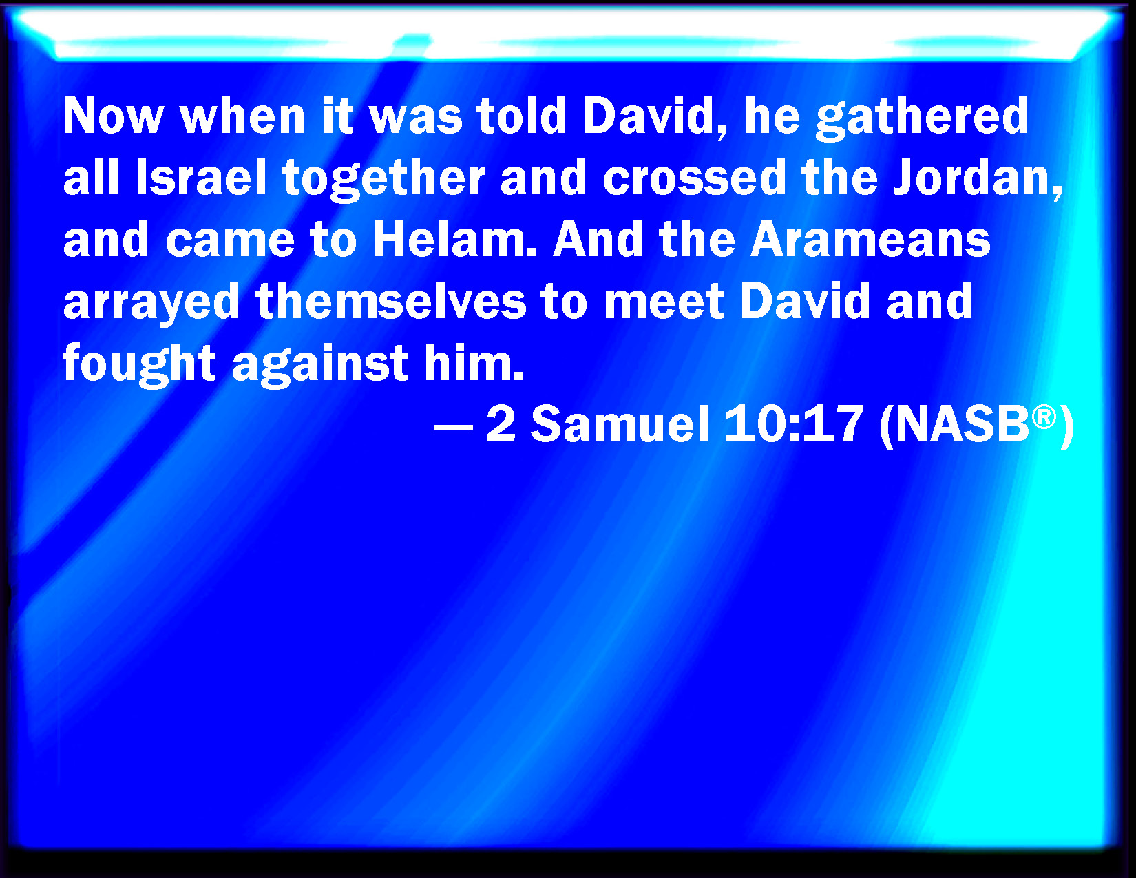 Bible Verse Slide 2 Samuel 10:17 And when it was told David, he gathered all Israel together, and passed over Jordan, and came to Helam. And the Syrians set themselves in array against David, and fought with him. KJV: And when it was told David, he gathered all Israel together, and passed over Jordan, and came to Helam. And the Syrians set themselves in array against David, and fought with him. DRB: And when this was told David, he gathered all Israel together, and passed over the Jordan, and came to Helam: and the Syrians set themselves in array against David, and fought against him. DBT: And it was told David; and he gathered all Israel, and passed over the Jordan, and came to Helam. And the Syrians set themselves in array against David, and fought with him. ERV: And it was told David; and he gathered all Israel together, and passed over Jordan, and came to Helam. And the Syrians set themselves in array against David, and fought with him. WBT: And when it was told David, he assembled all Israel, and passed over Jordan, and came to Helam. And the Syrians set themselves in array against David, and fought with him. WEB: It was told David; and he gathered all Israel together, and passed over the Jordan, and came to Helam. The Syrians set themselves in array against David, and fought with him. YLT: And it is declared to David, and he gathereth all Israel, and passeth over the Jordan, and cometh in to Helam, and Aram setteth itself in array to meet David, and they fight with him;Links 2 Samuel 10:17 NIV • 2 Samuel 10:17 NLT • 2 Samuel 10:17 ESV • 2 Samuel 10:17 NASB • 2 Samuel 10:17 KJV • 2 Samuel 10:17 Interlinear • 2 Samuel 10:17 Commentaries • 2 Samuel 10:17 Parallel Texts • 2 Samuel 10:17 Bible Apps • 2 Samuel 10:17 Parallel • Bible Hub |