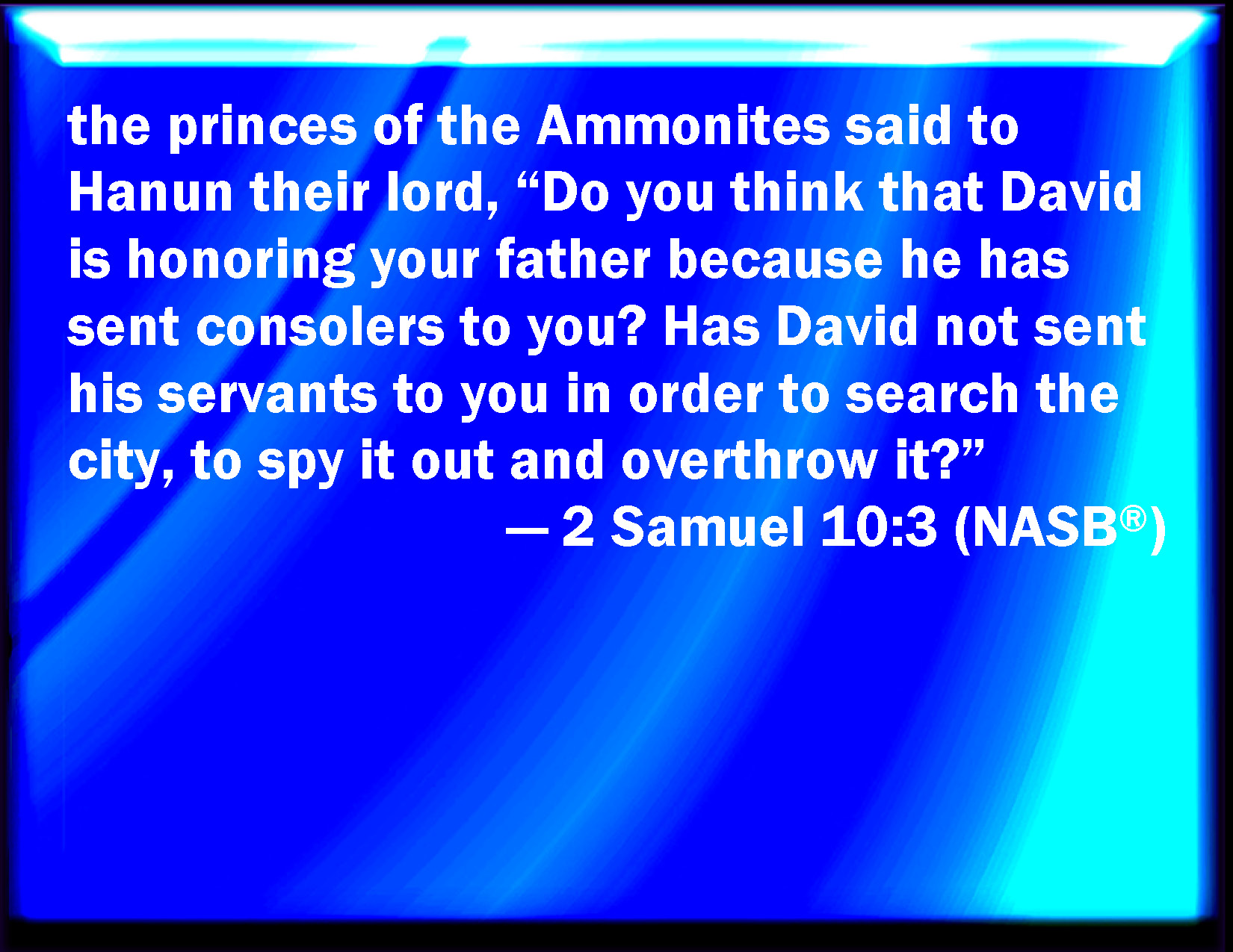 Bible Verse Slide 2 Samuel 10:3 And the princes of the children of Ammon said to Hanun their lord, Think you that David does honor your father, that he has sent comforters to you? has not David rather sent his servants to you, to search the city, and to spy it out, and to overthrow it? KJV: And the princes of the children of Ammon said unto Hanun their lord, Thinkest thou that David doth honour thy father, that he hath sent comforters unto thee? hath not David rather sent his servants unto thee, to search the city, and to spy it out, and to overthrow it? DRB: The princes of the children of Ammon said to Hanon their lord: Thinkest thou that for the honour of thy father, David hath sent comforters to thee, and hath not David rather sent his servants to thee to search, and spy into the city, and overthrow it? DBT: And the princes of the children of Ammon said to Hanun their lord, Is it, in thine eyes, to honour thy father that David has sent comforters to thee? Is it not to search the city and to spy it out, and to overthrow it, that David has sent his servants to thee? ERV: But the princes of the children of Ammon said unto Hanun their lord, Thinkest thou that David doth honour thy father, that he hath sent comforters unto thee? hath not David sent his servants unto thee to search the city, and to spy it out, and to overthrow it? WBT: And the princes of the children of Ammon said to Hanun their lord, Thinkest thou that David doth honor thy father, that he hath sent comforters to thee? hath not David rather sent his servants to thee, to search the city, and to spy it out, and to overthrow it? WEB: But the princes of the children of Ammon said to Hanun their lord, "Do you think that David honors your father, in that he has sent comforters to you? Hasn't David sent his servants to you to search the city, and to spy it out, and to overthrow it?" YLT: And the heads of the Bene-Ammon say unto Hanun their lord, 'Is David honouring thy father in thine eyes because he hath sent to thee comforters? for to search the city, and to spy it, and to overthrow it, hath not David sent his servants unto thee?'Links 2 Samuel 10:3 NIV • 2 Samuel 10:3 NLT • 2 Samuel 10:3 ESV • 2 Samuel 10:3 NASB • 2 Samuel 10:3 KJV • 2 Samuel 10:3 Interlinear • 2 Samuel 10:3 Commentaries • 2 Samuel 10:3 Parallel Texts • 2 Samuel 10:3 Bible Apps • 2 Samuel 10:3 Parallel • Bible Hub |