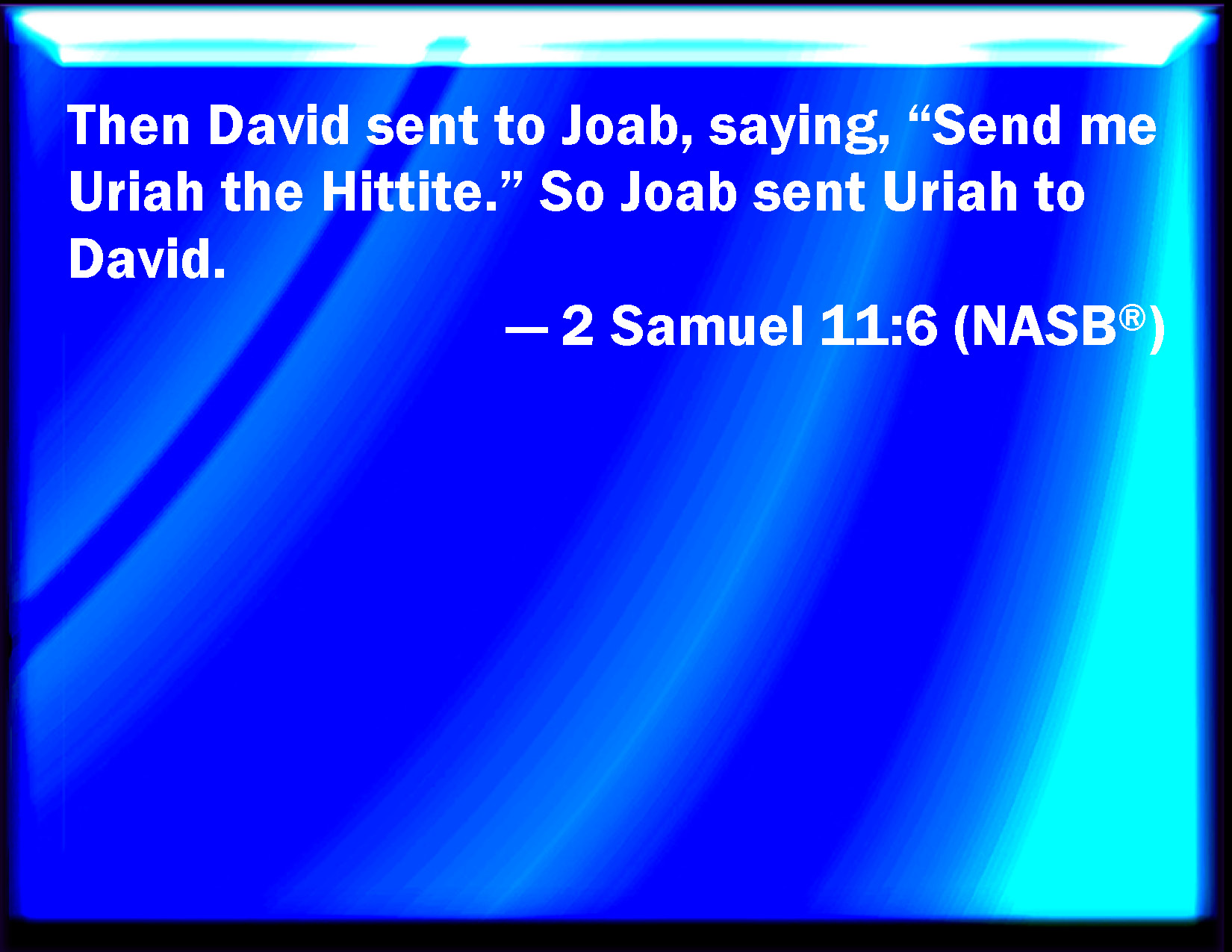 Bible Verse Slide 2 Samuel 11:6 And David sent to Joab, saying, Send me Uriah the Hittite. And Joab sent Uriah to David. KJV: And David sent to Joab, saying, Send me Uriah the Hittite. And Joab sent Uriah to David. DRB: And David sent to Joab, saying: Send me Urias the Hethite. And Joab sent Urias to David. DBT: And David sent to Joab saying, Send me Urijah the Hittite. And Joab sent Urijah to David. ERV: And David sent to Joab, saying, Send me Uriah the Hittite. And Joab sent Uriah to David. WBT: And David sent to Joab, saying, Send me Uriah the Hittite. And Joab sent Uriah to David. WEB: David sent to Joab, [saying], "Send me Uriah the Hittite." Joab sent Uriah to David. YLT: And David sendeth unto Joab, 'Send unto me Uriah the Hittite,' and Joab sendeth Uriah unto David;Links 2 Samuel 11:6 NIV • 2 Samuel 11:6 NLT • 2 Samuel 11:6 ESV • 2 Samuel 11:6 NASB • 2 Samuel 11:6 KJV • 2 Samuel 11:6 Interlinear • 2 Samuel 11:6 Commentaries • 2 Samuel 11:6 Parallel Texts • 2 Samuel 11:6 Bible Apps • 2 Samuel 11:6 Parallel • Bible Hub |
