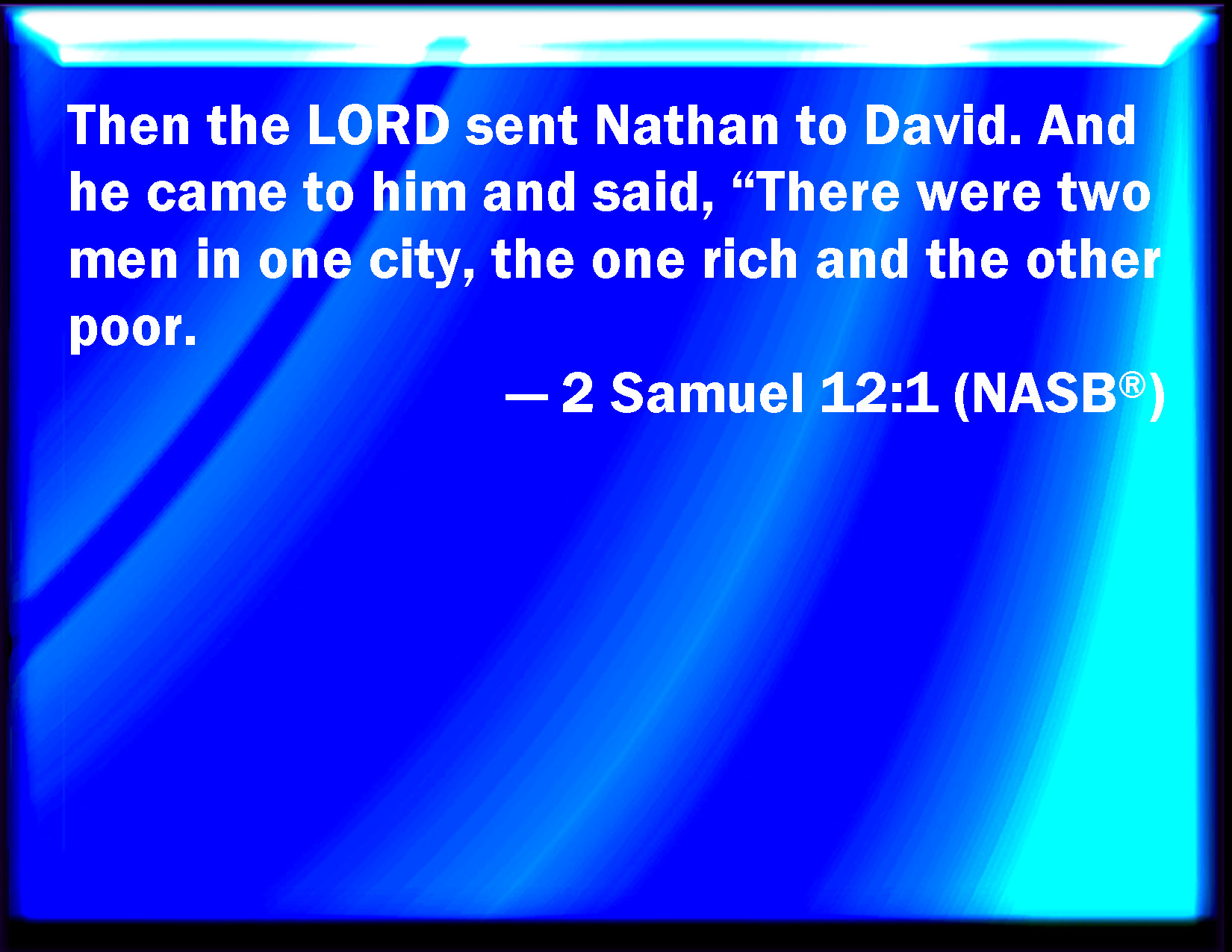 Bible Verse Slide 2 Samuel 12:1 And the LORD sent Nathan to David. And he came to him, and said to him, There were two men in one city; the one rich, and the other poor. KJV: And the LORD sent Nathan unto David. And he came unto him, and said unto him, There were two men in one city; the one rich, and the other poor. DRB: And the Lord sent Nathan to David: and when he was come to him, he said to him: There were two men in one city, the one rich, and the other poor. DBT: And Jehovah sent Nathan to David. And he came to him, and said to him, There were two men in one city; the one rich, and the other poor. ERV: And the LORD sent Nathan unto David. And he came unto him, and said unto him, There were two men in one city; the one rich, and the other poor. WBT: And the LORD sent Nathan to David. And he came to him, and said to him, There were two men in one city; the one rich, and the other poor. WEB: Yahweh sent Nathan to David. He came to him, and said to him, "There were two men in one city; the one rich, and the other poor. YLT: And Jehovah sendeth Nathan unto David, and he cometh unto him, and saith to him: 'Two men have been in one city; One rich and one poor;Links 2 Samuel 12:1 NIV • 2 Samuel 12:1 NLT • 2 Samuel 12:1 ESV • 2 Samuel 12:1 NASB • 2 Samuel 12:1 KJV • 2 Samuel 12:1 Interlinear • 2 Samuel 12:1 Commentaries • 2 Samuel 12:1 Parallel Texts • 2 Samuel 12:1 Bible Apps • 2 Samuel 12:1 Parallel • Bible Hub |