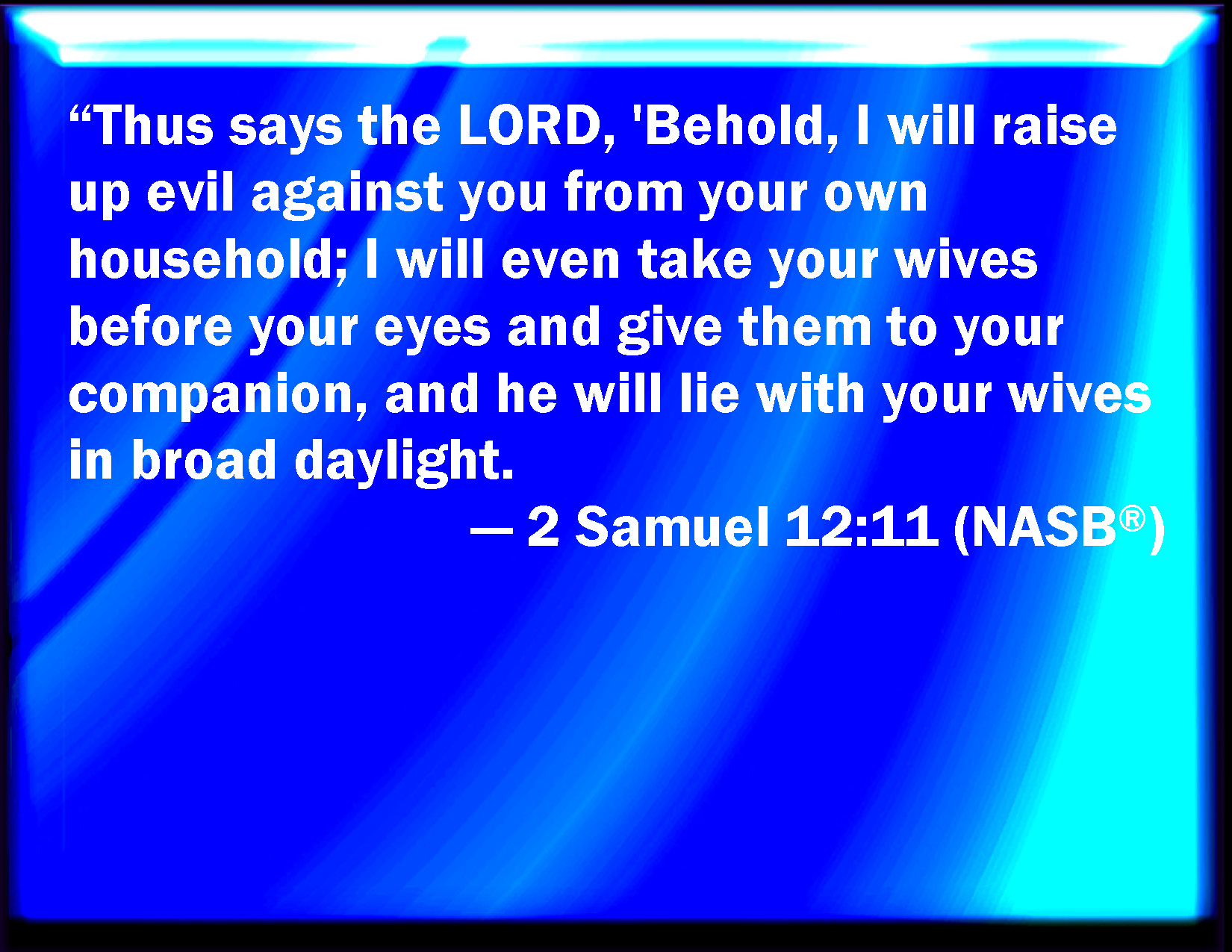 Bible Verse Slide 2 Samuel 12:11 Thus said the LORD, Behold, I will raise up evil against you out of your own house, and I will take your wives before your eyes, and give them to your neighbor, and he shall lie with your wives in the sight of this sun. KJV: Thus saith the LORD, Behold, I will raise up evil against thee out of thine own house, and I will take thy wives before thine eyes, and give them unto thy neighbour, and he shall lie with thy wives in the sight of this sun. DRB: Thus saith the Lord: Behold, I will raise up evil against thee out of thy own house, and I will take thy wives before thy eyes and give them to thy neighhour, and he shall lie with thy wives in the sight of this sun. DBT: Thus saith Jehovah: Behold, I will raise up evil against thee out of thine own house, and I will take thy wives before thine eyes, and give them unto thy neighbour, and he shall lie with thy wives in the sight of this sun. ERV: Thus saith the LORD, Behold, I will raise up evil against thee out of thine own house, and I will take thy wives before thine eyes, and give them unto thy neighbour, and he shall lie with thy wives in the sight of this sun. WBT: Thus saith the LORD, Behold, I will raise up evil against thee out of thy own house, and I will take thy wives before thy eyes, and give them to thy neighbor, and he shall lie with thy wives in the sight of this sun. WEB: "This is what Yahweh says: 'Behold, I will raise up evil against you out of your own house; and I will take your wives before your eyes, and give them to your neighbor, and he will lie with your wives in the sight of this sun. YLT: thus said Jehovah, Lo, I am raising up against thee evil, out of thy house, and have taken thy wives before thine eyes, and given to thy neighbour, and he hath lain with thy wives before the eyes of this sun;Links 2 Samuel 12:11 NIV • 2 Samuel 12:11 NLT • 2 Samuel 12:11 ESV • 2 Samuel 12:11 NASB • 2 Samuel 12:11 KJV • 2 Samuel 12:11 Interlinear • 2 Samuel 12:11 Commentaries • 2 Samuel 12:11 Parallel Texts • 2 Samuel 12:11 Bible Apps • 2 Samuel 12:11 Parallel • Bible Hub |