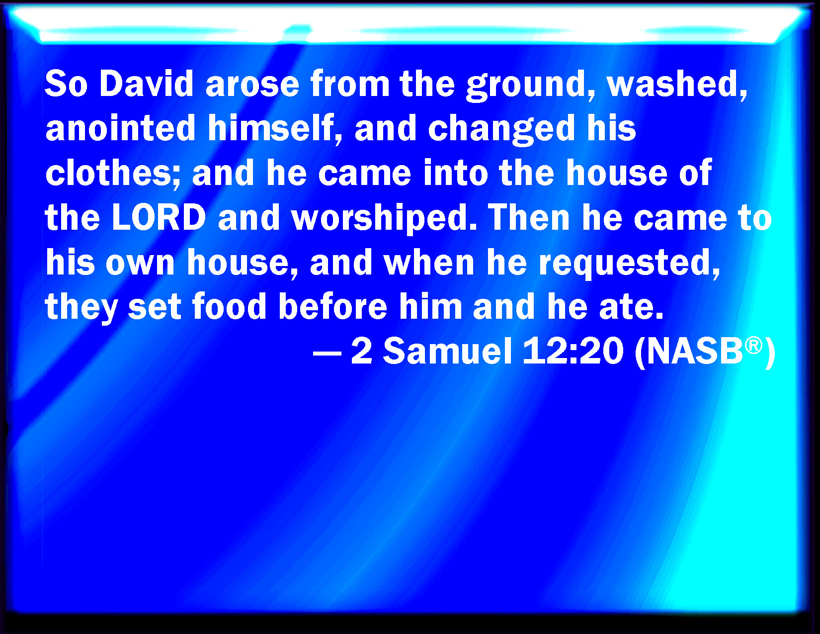 Bible Verse Slide 2 Samuel 12:20 Then David arose from the earth, and washed, and anointed himself, and changed his apparel, and came into the house of the LORD, and worshipped: then he came to his own house; and when he required, they set bread before him, and he did eat. KJV: Then David arose from the earth, and washed, and anointed himself, and changed his apparel, and came into the house of the LORD, and worshipped: then he came to his own house; and when he required, they set bread before him, and he did eat. DRB: Then David arose from the ground, and washed and anointed himself: and when he had changed his apparel, he went into the house of the Lord: and worshipped, and then he came into his own house, and he called for bread, and ate. DBT: Then David arose from the earth, and washed, and anointed himself, and changed his clothing, and entered into the house of Jehovah and worshipped; then he came to his own house and required them to set bread before him, and he ate. ERV: Then David arose from the earth, and washed, and anointed himself, and changed his apparel; and he came into the house of the LORD, and worshipped: then he came to his own house; and when he required they set bread before him, and he did eat. WBT: Then David arose from the earth, and washed, and anointed himself, and changed his apparel, and came into the house of the LORD, and worshiped: then he came to his own house; and when he required, they set bread before him, and he ate. WEB: Then David arose from the earth, and washed, and anointed himself, and changed his clothing; and he came into the house of Yahweh, and worshiped: then he came to his own house; and when he required, they set bread before him, and he ate. YLT: And David riseth from the earth, and doth bathe and anoint himself, and changeth his raiment, and cometh in to the house of Jehovah, and boweth himself, and cometh unto his house, and asketh and they place for him bread, and he eateth.Links 2 Samuel 12:20 NIV • 2 Samuel 12:20 NLT • 2 Samuel 12:20 ESV • 2 Samuel 12:20 NASB • 2 Samuel 12:20 KJV • 2 Samuel 12:20 Interlinear • 2 Samuel 12:20 Commentaries • 2 Samuel 12:20 Parallel Texts • 2 Samuel 12:20 Bible Apps • 2 Samuel 12:20 Parallel • Bible Hub |