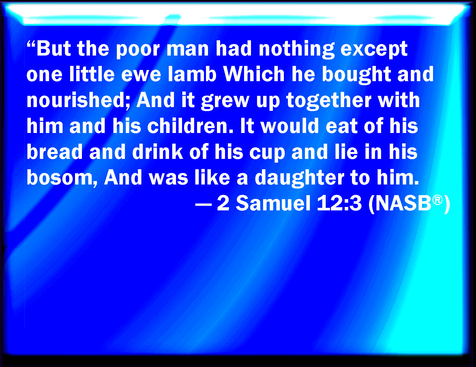 Bible Verse Slide 2 Samuel 12:3 But the poor man had nothing, save one little ewe lamb, which he had bought and nourished up: and it grew up together with him, and with his children; it did eat of his own meat, and drank of his own cup, and lay in his bosom, and was to him as a daughter. KJV: But the poor man had nothing, save one little ewe lamb, which he had bought and nourished up: and it grew up together with him, and with his children; it did eat of his own meat, and drank of his own cup, and lay in his bosom, and was unto him as a daughter. DRB: But the poor man had nothing at all but one little ewe lamb, which he had bought and nourished up, and which had grown up in his house together with his children, eating of his bread, and drinking of his cup, and sleeping in his bosom: and it was unto him as a daughter. DBT: but the poor man had nothing at all, but one little ewe lamb which he had bought, and was nourishing; and it grew up with him, and together with his children: it ate of his morsel, and drank of his own cup, and slept in his bosom, and was to him as a daughter. ERV: but the poor man had nothing, save one little ewe lamb, which he had bought and nourished up: and it grew up together with him, and with his children; it did eat of his own morsel, and drank of his own cup, and lay in his bosom, and was unto him as a daughter. WBT: But the poor man had nothing save one little ewe-lamb, which he had bought and nourished: and it grew up together with him, and with his children: it fed of his own meat, and drank of his own cup, and lay in his bosom, and was to him as a daughter. WEB: but the poor man had nothing, except one little ewe lamb, which he had bought and raised. It grew up together with him, and with his children. It ate of his own food, drank of his own cup, and lay in his bosom, and was to him like a daughter. YLT: And the poor one hath nothing, Except one little ewe-lamb, Which he hath bought, and keepeth alive, And it groweth up with him, And with his sons together; Of his morsel it eateth, And from his cup it drinketh, And in his bosom it lieth, And it is to him as a daughter;Links 2 Samuel 12:3 NIV • 2 Samuel 12:3 NLT • 2 Samuel 12:3 ESV • 2 Samuel 12:3 NASB • 2 Samuel 12:3 KJV • 2 Samuel 12:3 Interlinear • 2 Samuel 12:3 Commentaries • 2 Samuel 12:3 Parallel Texts • 2 Samuel 12:3 Bible Apps • 2 Samuel 12:3 Parallel • Bible Hub |