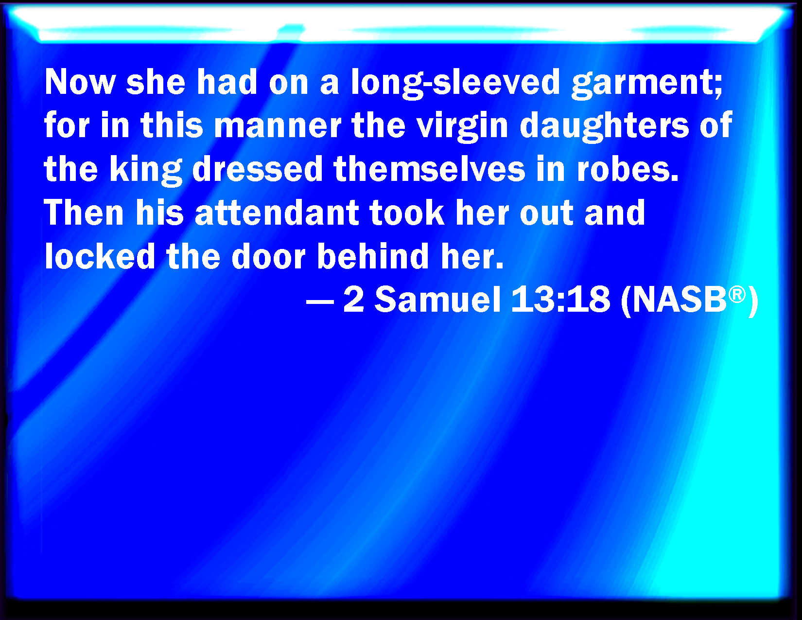 Bible Verse Slide 2 Samuel 13:18 And she had a garment of divers colors on her: for with such robes were the king's daughters that were virgins appareled. Then his servant brought her out, and bolted the door after her. KJV: And she had a garment of divers colours upon her: for with such robes were the king's daughters that were virgins apparelled. Then his servant brought her out, and bolted the door after her. DRB: And she was clothed with along robe: for the king's daughters that were virgins, used such kind of garments. Then his servant thrust her out: and shut the door after her. DBT: Now she had a vest of many colours upon her; for so were the king's daughters that were virgins apparelled. And his attendant brought her out, and bolted the door after her. ERV: And she had a garment of divers colours upon her: for with such robes were the king's daughters that were virgins apparelled. Then his servant brought her out, and bolted the door after her. WBT: And she had a garment of divers colors upon her: for with such robes were the king's daughters that were virgins appareled. Then his servant brought her out, and bolted the door after her. WEB: She had a garment of various colors on her; for with such robes were the king's daughters who were virgins dressed. Then his servant brought her out, and bolted the door after her. YLT: — and upon her is a long coat, for such upper robes do daughters of the king who are virgins put on, — and his servant taketh her out without, and hath bolted the door after her.Links 2 Samuel 13:18 NIV • 2 Samuel 13:18 NLT • 2 Samuel 13:18 ESV • 2 Samuel 13:18 NASB • 2 Samuel 13:18 KJV • 2 Samuel 13:18 Interlinear • 2 Samuel 13:18 Commentaries • 2 Samuel 13:18 Parallel Texts • 2 Samuel 13:18 Bible Apps • 2 Samuel 13:18 Parallel • Bible Hub |