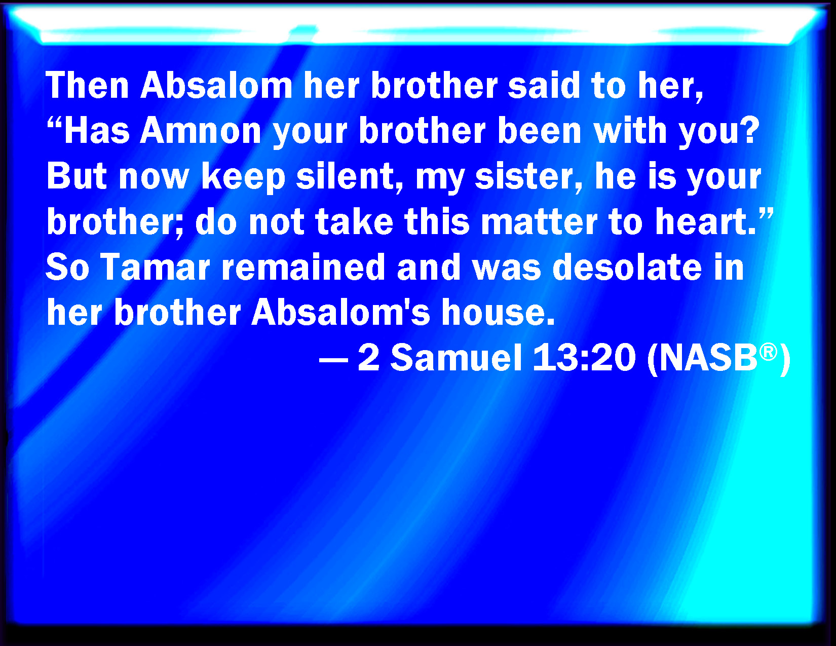 Bible Verse Slide 2 Samuel 13:20 And Absalom her brother said to her, Has Amnon your brother been with you? but hold now your peace, my sister: he is your brother; regard not this thing. So Tamar remained desolate in her brother Absalom's house. KJV: And Absalom her brother said unto her, Hath Amnon thy brother been with thee? but hold now thy peace, my sister: he is thy brother; regard not this thing. So Tamar remained desolate in her brother Absalom's house. DRB: And Absalom her brother said to her: Hath thy brother Amnon lain with thee? but now, sister, hold thy peace, he is thy brother: and afflict not thy heart for this thing. So Thamar remained pining away in the house of Absalom her brother. DBT: And Absalom her brother said to her, Has Amnon thy brother been with thee? and now, my sister, be still: he is thy brother; take not this thing to heart. And Tamar remained, and that desolate, in her brother Absalom's house. ERV: And Absalom her brother said unto her, Hath Amnon thy brother been with thee? but now hold thy peace, my sister: he is thy brother; take not this thing to heart. So Tamar remained desolate in her brother Absalom's house. WBT: And Absalom her brother said to her, Hath Amnon thy brother been with thee? but hold now thy peace, my sister: he is thy brother; regard not this thing. So Tamar remained desolate in her brother Absalom's house. WEB: Absalom her brother said to her, "Has Amnon your brother been with you? But now hold your peace, my sister. He is your brother. Don't take this thing to heart." So Tamar remained desolate in her brother Absalom's house. YLT: and Absalom her brother saith unto her, 'Hath Amnon thy brother been with thee? and now, my sister, keep silent, he is thy brother; set not thy heart to this thing;' and Tamar dwelleth — but desolate — in the house of Absalom her brother.Links 2 Samuel 13:20 NIV • 2 Samuel 13:20 NLT • 2 Samuel 13:20 ESV • 2 Samuel 13:20 NASB • 2 Samuel 13:20 KJV • 2 Samuel 13:20 Interlinear • 2 Samuel 13:20 Commentaries • 2 Samuel 13:20 Parallel Texts • 2 Samuel 13:20 Bible Apps • 2 Samuel 13:20 Parallel • Bible Hub |