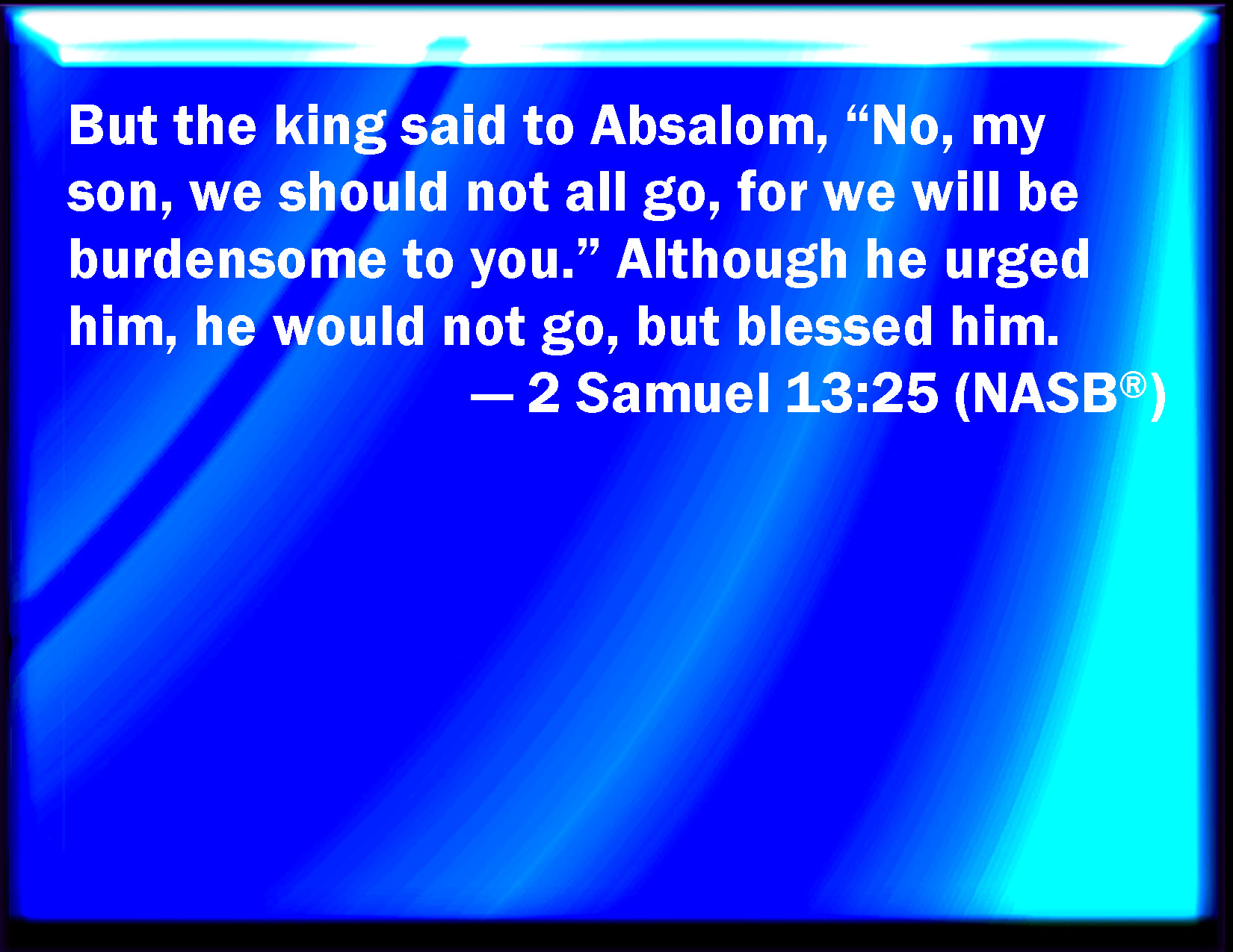 Bible Verse Slide 2 Samuel 13:25 And the king said to Absalom, No, my son, let us not all now go, lest we be chargeable to you. And he pressed him: however, he would not go, but blessed him. KJV: And the king said to Absalom, Nay, my son, let us not all now go, lest we be chargeable unto thee. And he pressed him: howbeit he would not go, but blessed him. DRB: And the king said to Absalom: Nay, my son, do not ask that we should all come, and be chargeable to thee. And when he pressed him, and he would not go, he blessed him. DBT: And the king said to Absalom, No, my son, let us not all go, lest we be burdensome to thee. And he urged him, but he would not go; and he blessed him. ERV: And the king said to Absalom, Nay, my son, let us not all go, lest we be burdensome unto thee. And he pressed him: howbeit he would not go, but blessed him. WBT: And the king said to Absalom, Nay, my son, let us not all now go, lest we be chargeable to thee. And he pressed him: yet he would not go, but blessed him. WEB: The king said to Absalom, "No, my son, let us not all go, lest we be burdensome to you." He pressed him; however he would not go, but blessed him. YLT: And the king saith unto Absalom, 'Nay, my son, let us not all go, I pray thee, and we are not too heavy on thee;' and he presseth on him, and he hath not been willing to go, and he blesseth him.Links 2 Samuel 13:25 NIV • 2 Samuel 13:25 NLT • 2 Samuel 13:25 ESV • 2 Samuel 13:25 NASB • 2 Samuel 13:25 KJV • 2 Samuel 13:25 Interlinear • 2 Samuel 13:25 Commentaries • 2 Samuel 13:25 Parallel Texts • 2 Samuel 13:25 Bible Apps • 2 Samuel 13:25 Parallel • Bible Hub |