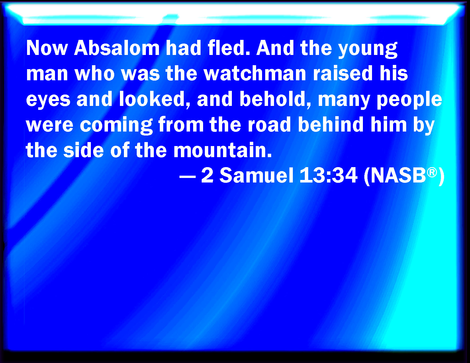 Bible Verse Slide 2 Samuel 13:34 But Absalom fled. And the young man that kept the watch lifted up his eyes, and looked, and, behold, there came much people by the way of the hill side behind him. KJV: But Absalom fled. And the young man that kept the watch lifted up his eyes, and looked, and, behold, there came much people by the way of the hill side behind him. DRB: But Absalom fled away: and the young man that kept the watch, lifted up his eyes and looked, and behold there came much people by a by-way on the side of the mountain. DBT: And Absalom fled. And the young man that watched lifted up his eyes and looked, and behold, there came much people from the way behind him, from the hill-side. ERV: But Absalom fled. And the young man that kept the watch lifted up his eyes, and looked, and, behold, there came much people by the way of the hill side behind him. WBT: But Absalom fled. And the young man that kept the watch lifted up his eyes, and looked, and behold, there came many people by the way of the hillside behind him. WEB: But Absalom fled. The young man who kept the watch lifted up his eyes, and looked, and behold, many people were coming by way of the hillside behind him. YLT: And Absalom fleeth, and the young man who is watching lifteth up his eyes and looketh, and lo, much people are coming by the way behind him, on the side of the hill.Links 2 Samuel 13:34 NIV • 2 Samuel 13:34 NLT • 2 Samuel 13:34 ESV • 2 Samuel 13:34 NASB • 2 Samuel 13:34 KJV • 2 Samuel 13:34 Interlinear • 2 Samuel 13:34 Commentaries • 2 Samuel 13:34 Parallel Texts • 2 Samuel 13:34 Bible Apps • 2 Samuel 13:34 Parallel • Bible Hub |