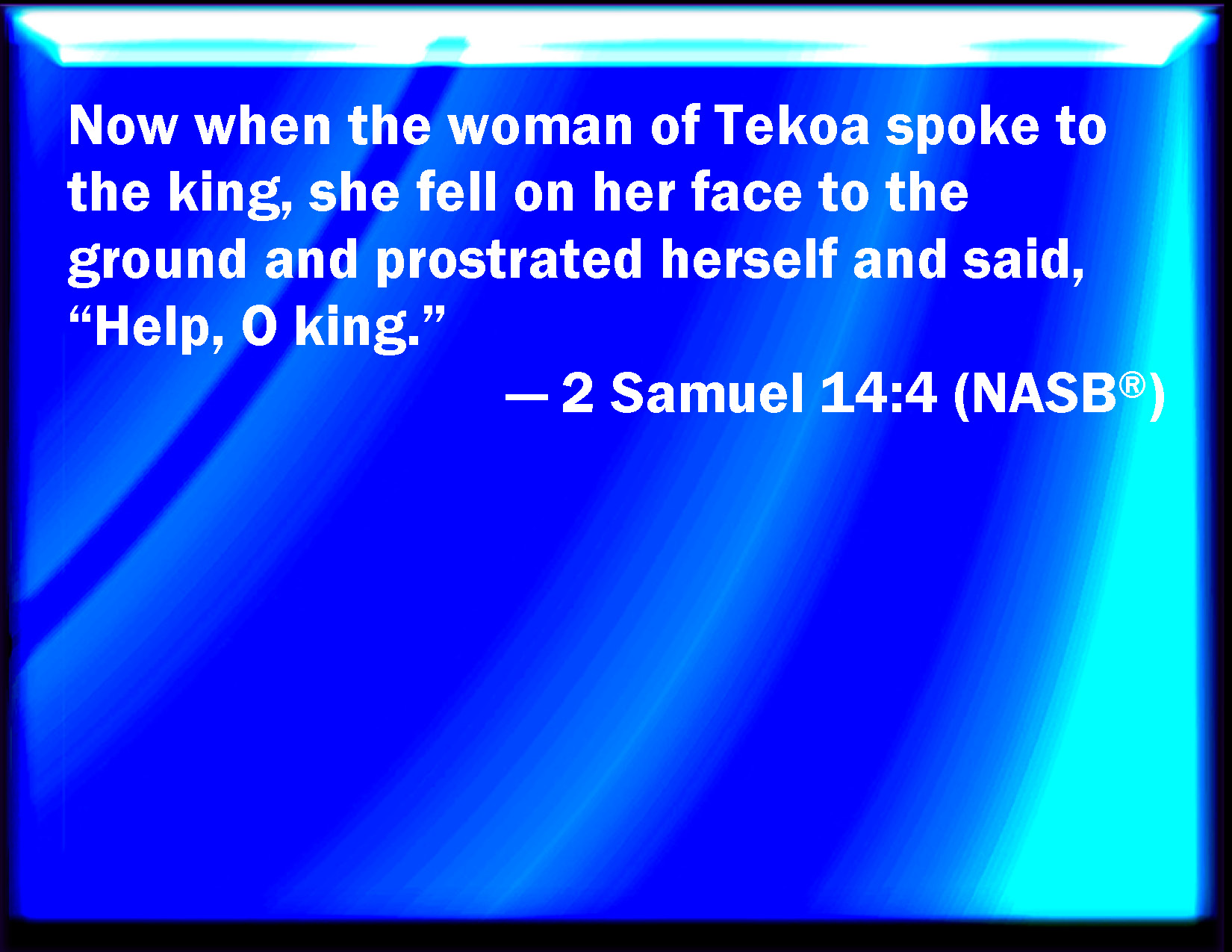 Bible Verse Slide 2 Samuel 14:4 And when the woman of Tekoah spoke to the king, she fell on her face to the ground, and did obeisance, and said, Help, O king. KJV: And when the woman of Tekoah spake to the king, she fell on her face to the ground, and did obeisance, and said, Help, O king. DRB: And when the woman of Thecua was come in to the king, she fell before him upon the ground, and worshipped, and said: Save me, O king. DBT: And the woman of Tekoah spoke to the king, and she fell on her face to the ground and did obeisance, and said, Save, O king! ERV: And when the woman of Tekoa spake to the king, she fell on her face to the ground, and did obeisance, and said, Help, O king. WBT: And when the woman of Tekoah spoke to the king, she fell on her face to the ground, and did obeisance, and said, Help, O king. WEB: When the woman of Tekoa spoke to the king, she fell on her face to the ground, and did obeisance, and said, "Help, O king!" YLT: And the woman of Tekoah speaketh unto the king, and falleth on her face to the earth, and doth obeisance, and saith, 'Save, O king.'Links 2 Samuel 14:4 NIV • 2 Samuel 14:4 NLT • 2 Samuel 14:4 ESV • 2 Samuel 14:4 NASB • 2 Samuel 14:4 KJV • 2 Samuel 14:4 Interlinear • 2 Samuel 14:4 Commentaries • 2 Samuel 14:4 Parallel Texts • 2 Samuel 14:4 Bible Apps • 2 Samuel 14:4 Parallel • Bible Hub |