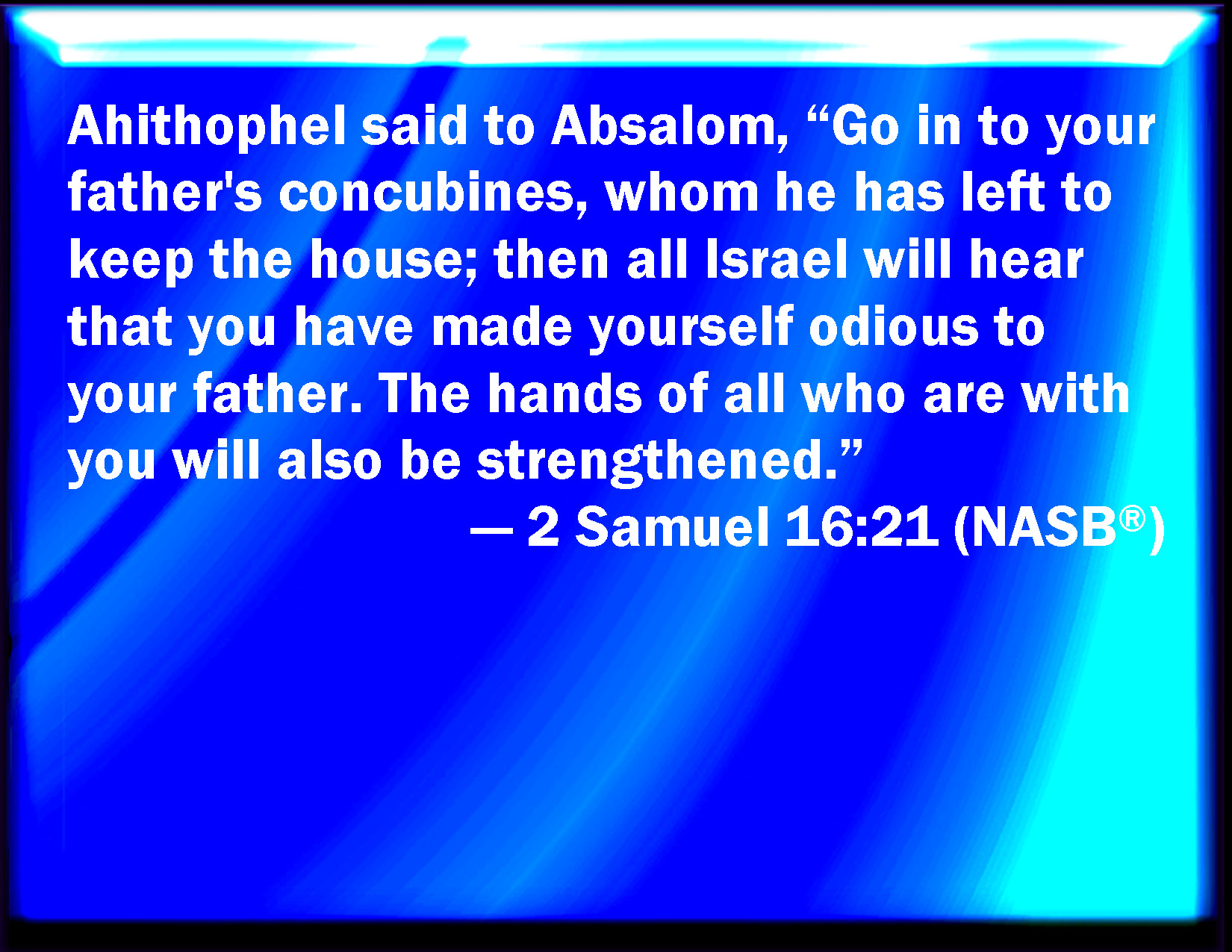 Bible Verse Slide 2 Samuel 16:21 And Ahithophel said to Absalom, Go in to your father's concubines, which he has left to keep the house; and all Israel shall hear that you are abhorred of your father: then shall the hands of all that are with you be strong. KJV: And Ahithophel said unto Absalom, Go in unto thy father's concubines, which he hath left to keep the house; and all Israel shall hear that thou art abhorred of thy father: then shall the hands of all that are with thee be strong. DRB: And Achitophel said to Absalom: Go in to the concubines of thy father, whom he hath left to keep the house: that when all Israel shall hear that thou hast disgraced thy father, their hands may be strengthened with thee. DBT: And Ahithophel said to Absalom, Go in to thy father's concubines, whom he has left to keep the house; and all Israel shall hear that thou art become odious with thy father; and the hands of all that are with thee shall be strong. ERV: And Ahithophel said unto Absalom, Go in unto thy father's concubines, which he hath left to keep the house; and all Israel shall hear that thou art abhorred of thy father: then shall the hands of all that are with thee be strong. WBT: And Ahithophel said to Absalom, Go in to thy father's concubines, which he hath left to keep the house; and all Israel shall hear that thou art abhorred by thy father: then shall the hands of all that are with thee be strong. WEB: Ahithophel said to Absalom, "Go in to your father's concubines, that he has left to keep the house. Then all Israel will hear that you are abhorred by your father. Then the hands of all who are with you will be strong." YLT: And Ahithophel saith unto Absalom, 'Go in unto the concubines of thy father, whom he left to keep the house, and all Israel hath heard that thou hast been abhorred by thy father, and the hands of all who are with thee have been strong.'Links 2 Samuel 16:21 NIV • 2 Samuel 16:21 NLT • 2 Samuel 16:21 ESV • 2 Samuel 16:21 NASB • 2 Samuel 16:21 KJV • 2 Samuel 16:21 Interlinear • 2 Samuel 16:21 Commentaries • 2 Samuel 16:21 Parallel Texts • 2 Samuel 16:21 Bible Apps • 2 Samuel 16:21 Parallel • Bible Hub |