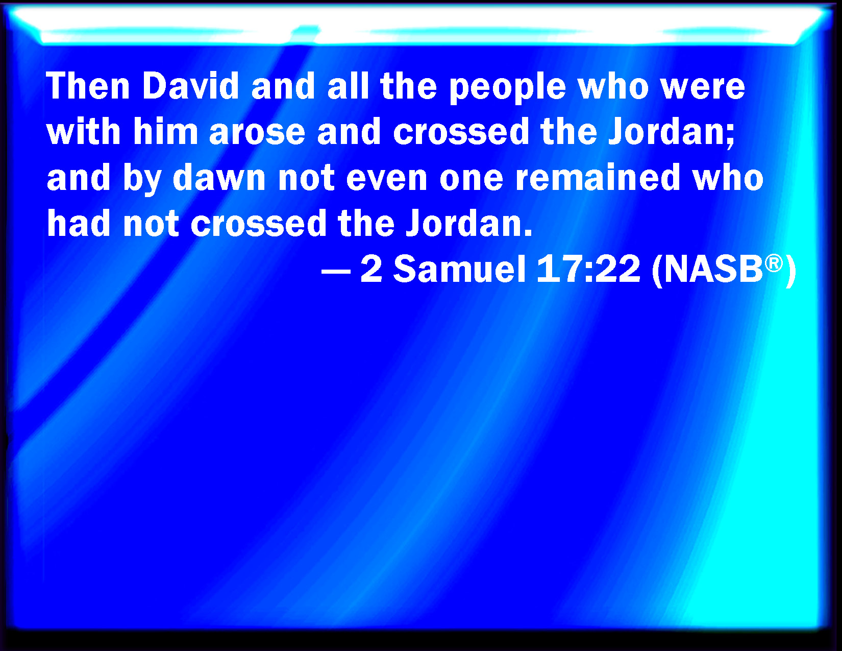 Bible Verse Slide 2 Samuel 17:22 Then David arose, and all the people that were with him, and they passed over Jordan: by the morning light there lacked not one of them that was not gone over Jordan. KJV: Then David arose, and all the people that were with him, and they passed over Jordan: by the morning light there lacked not one of them that was not gone over Jordan. DRB: So David arose, and all the people that were with him, and they passed over the Jordan, until it grew light, and not one of them was left that was not gone over the river. DBT: Then David arose, and all the people that were with him, and they passed over the Jordan; by the morning light there was not one of them missing that had not gone over the Jordan. ERV: Then David arose, and all the people that were with him, and they passed over Jordan: by the morning light there lacked not one of them that was not gone over Jordan. WBT: Then David arose, and all the people that were with him, and they passed over Jordan: by the morning light there lacked not one of them that had not gone over Jordan. WEB: Then David arose, and all the people who were with him, and they passed over the Jordan. By the morning light there lacked not one of them who had not gone over the Jordan. YLT: And David riseth, and all the people who are with him, and they pass over the Jordan, till the light of the morning, till one hath not been lacking who hath not passed over the Jordan.Links 2 Samuel 17:22 NIV • 2 Samuel 17:22 NLT • 2 Samuel 17:22 ESV • 2 Samuel 17:22 NASB • 2 Samuel 17:22 KJV • 2 Samuel 17:22 Interlinear • 2 Samuel 17:22 Commentaries • 2 Samuel 17:22 Parallel Texts • 2 Samuel 17:22 Bible Apps • 2 Samuel 17:22 Parallel • Bible Hub |