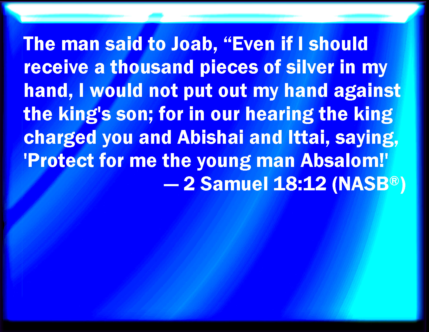 Bible Verse Slide 2 Samuel 18:12 And the man said to Joab, Though I should receive a thousand shekels of silver in my hand, yet would I not put forth my hand against the king's son: for in our hearing the king charged you and Abishai and Ittai, saying, Beware that none touch the young man Absalom. KJV: And the man said unto Joab, Though I should receive a thousand shekels of silver in mine hand, yet would I not put forth mine hand against the king's son: for in our hearing the king charged thee and Abishai and Ittai, saying, Beware that none touch the young man Absalom. DRB: And he said to Joab: If thou wouldst have paid down in my hands a thousand pieces of silver, I would not lay my hands upon the king's son: for in our hearing he king charged thee, and Abisai, and Ethai, saying: Save me the boy Absalom. DBT: And the man said to Joab, Though I should receive a thousand silver pieces in my hand, yet would I not put forth my hand against the king's son; for in our hearing the king charged thee and Abishai and Ittai, saying, Take care, whoever it be of you, of the young man Absalom. ERV: And the man said unto Joab, Though I should receive a thousand pieces of silver in mine hand, yet would I not put forth mine hand against the king's son: for in our hearing the king charged thee and Abishai and Ittai, saying, Beware that none touch the young man Absalom. WBT: And the man said to Joab, Though I should receive a thousand shekels of silver in my hand, yet would I not put forth my hand against the king's son: for in our hearing the king charged thee and Abishai and Ittai, saying, Beware that none touch the young man Absalom. WEB: The man said to Joab, "Though I should receive a thousand pieces of silver in my hand, I still wouldn't put forth my hand against the king's son; for in our hearing the king commanded you and Abishai and Ittai, saying, 'Beware that none touch the young man Absalom.' YLT: And the man saith unto Joab, 'Yea, though I am weighing on my hand a thousand silverlings, I do not put forth my hand unto the son of the king; for in our ears hath the king charged thee, and Abishai, and Ittai, saying, Observe ye who is against the youth — against Absalom;Links 2 Samuel 18:12 NIV • 2 Samuel 18:12 NLT • 2 Samuel 18:12 ESV • 2 Samuel 18:12 NASB • 2 Samuel 18:12 KJV • 2 Samuel 18:12 Interlinear • 2 Samuel 18:12 Commentaries • 2 Samuel 18:12 Parallel Texts • 2 Samuel 18:12 Bible Apps • 2 Samuel 18:12 Parallel • Bible Hub |