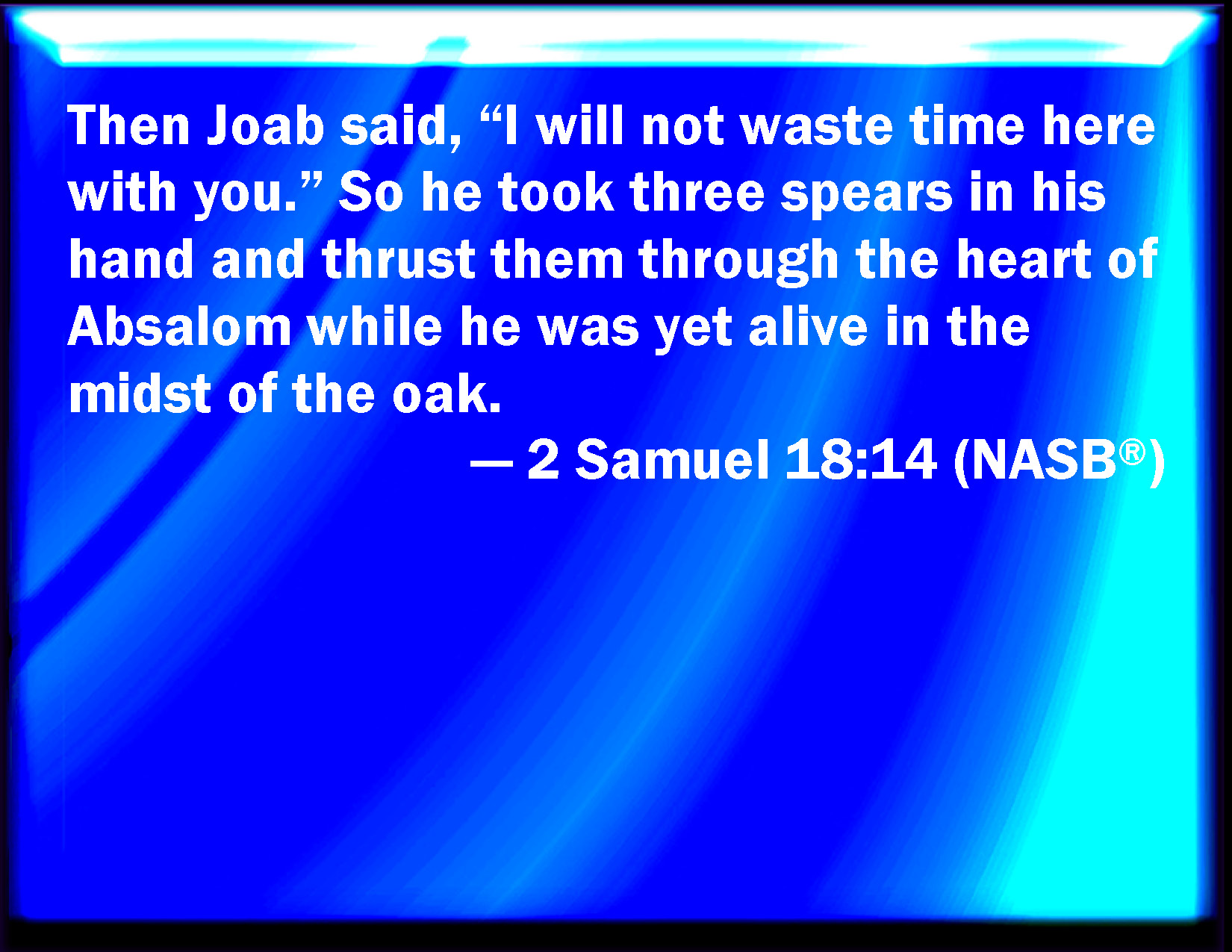 Bible Verse Slide 2 Samuel 18:14 Then said Joab, I may not tarry thus with you. And he took three darts in his hand, and thrust them through the heart of Absalom, while he was yet alive in the middle of the oak. KJV: Then said Joab, I may not tarry thus with thee. And he took three darts in his hand, and thrust them through the heart of Absalom, while he was yet alive in the midst of the oak. DRB: And Joab said: Not as thou wilt, but will set upon him in thy sight. So he took three lances in his hand, and thrust them into the heart of Absalom: and whilst he yet panted for life, sticking on the oak, DBT: Then said Joab, I may not tarry thus with thee. And he took three spears in his hand, and thrust them into Absalom's body, while he was yet alive in the midst of the terebinth. ERV: Then said Joab, I may not tarry thus with thee. And he took three darts in his hand, and thrust them through the heart of Absalom, while he was yet alive in the midst of the oak. WBT: Then said Joab, I may not tarry thus with thee. And he took three darts in his hand, and thrust them through the heart of Absalom, while he was yet alive in the midst of the oak. WEB: Then Joab said, "I'm not going to wait like this with you." He took three darts in his hand, and thrust them through the heart of Absalom, while he was yet alive in the midst of the oak. YLT: And Joab saith, 'Not right — I tarry before thee;' and he taketh three darts in his hand, and striketh them into the heart of Absalom, while he is alive, in the midst of the oak.Links 2 Samuel 18:14 NIV • 2 Samuel 18:14 NLT • 2 Samuel 18:14 ESV • 2 Samuel 18:14 NASB • 2 Samuel 18:14 KJV • 2 Samuel 18:14 Interlinear • 2 Samuel 18:14 Commentaries • 2 Samuel 18:14 Parallel Texts • 2 Samuel 18:14 Bible Apps • 2 Samuel 18:14 Parallel • Bible Hub |