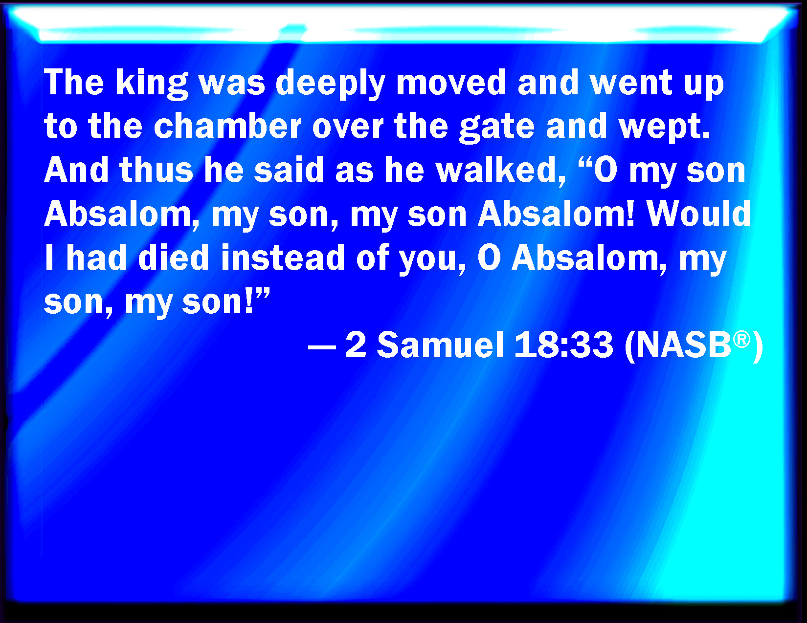 Bible Verse Slide 2 Samuel 18:33 And the king was much moved, and went up to the chamber over the gate, and wept: and as he went, thus he said, O my son Absalom, my son, my son Absalom! would God I had died for you, O Absalom, my son, my son! KJV: And the king was much moved, and went up to the chamber over the gate, and wept: and as he went, thus he said, O my son Absalom, my son, my son Absalom! would God I had died for thee, O Absalom, my son, my son! DRB: The king therefore being much moved, went up to the high chamber over the gate, and wept. And as he went he spoke in this manner: My son Absalom, Absalom my son: would to God that I might die for thee, Absalom my son, my son Absalom. DBT: And the king was much moved, and went up to the upper chamber of the gate, and wept; and as he went, he said thus: O my son Absalom, my son, my son Absalom! would God I had died in thy stead, O Absalom, my son, my son! ERV: And the king was much moved, and went up to the chamber over the gate, and wept: and as he went, thus he said, O my son Absalom, my son, my son Absalom! would God I had died for thee, O Absalom, my son, my son! WBT: And the king was much moved, and went up to the chamber over the gate, and wept: and as he went, thus he said, O my son Absalom, my son, my son Absalom! O that I had died for thee, O Absalom, my son, my son! WEB: The king was much moved, and went up to the room over the gate, and wept. As he went, he said, "My son Absalom! My son, my son Absalom! I wish I had died for you, Absalom, my son, my son!" YLT: And the king trembleth, and goeth up on the upper chamber of the gate, and weepeth, and thus he hath said in his going, 'My son! Absalom my son; my son Absalom; oh that I had died for thee, Absalom, my son, my son.'Links 2 Samuel 18:33 NIV • 2 Samuel 18:33 NLT • 2 Samuel 18:33 ESV • 2 Samuel 18:33 NASB • 2 Samuel 18:33 KJV • 2 Samuel 18:33 Interlinear • 2 Samuel 18:33 Commentaries • 2 Samuel 18:33 Parallel Texts • 2 Samuel 18:33 Bible Apps • 2 Samuel 18:33 Parallel • Bible Hub |