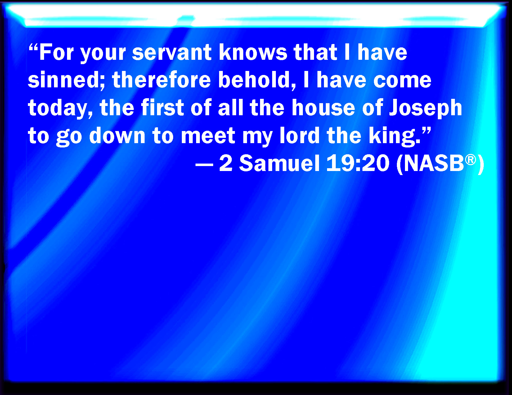 Bible Verse Slide 2 Samuel 19:20 For your servant does know that I have sinned: therefore, behold, I am come the first this day of all the house of Joseph to go down to meet my lord the king. KJV: For thy servant doth know that I have sinned: therefore, behold, I am come the first this day of all the house of Joseph to go down to meet my lord the king. DRB: For I thy servant acknowledge my sin: and therefore I am come this day the first of all the house of Joseph, and am come down to meet my lord the king. DBT: For thy servant knows that I have sinned; and behold, I am come the first this day of all the house of Joseph to go down to meet my lord the king. ERV: For thy servant doth know that I have sinned: therefore, behold, I am come this day the first of all the house of Joseph to go down to meet my lord the king. WBT: For thy servant doth know that I have sinned: therefore behold, I have come the first this day of all the house of Joseph to go down to meet my lord the king. WEB: For your servant knows that I have sinned. Therefore, behold, I have come this day the first of all the house of Joseph to go down to meet my lord the king." YLT: for thy servant hath known that I have sinned; and lo, I have come to-day, first of all the house of Joseph, to go down to meet my lord the king.'Links 2 Samuel 19:20 NIV • 2 Samuel 19:20 NLT • 2 Samuel 19:20 ESV • 2 Samuel 19:20 NASB • 2 Samuel 19:20 KJV • 2 Samuel 19:20 Interlinear • 2 Samuel 19:20 Commentaries • 2 Samuel 19:20 Parallel Texts • 2 Samuel 19:20 Bible Apps • 2 Samuel 19:20 Parallel • Bible Hub |