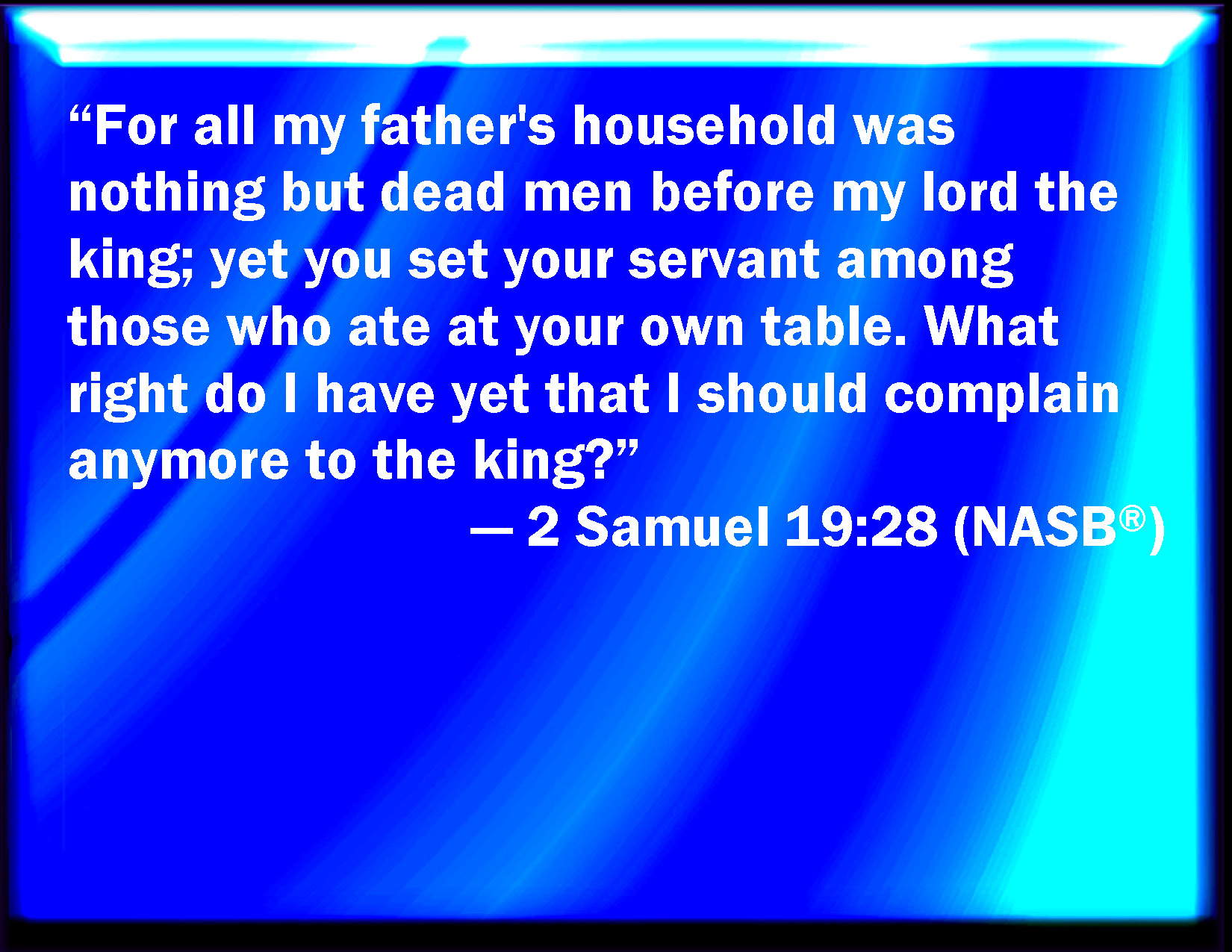 2 Samuel 19:28 For all of my father's house were but dead men before my lord the king: yet did you set your servant among them that did eat at your own table. What right therefore have I yet to cry any more to the king?