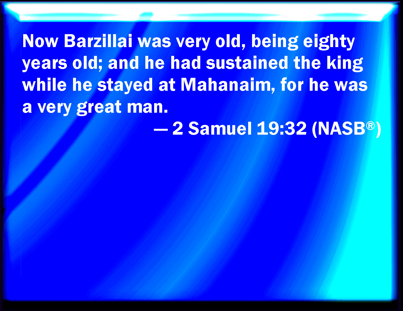 Bible Verse Slide 2 Samuel 19:32 Now Barzillai was a very aged man, even fourscore years old: and he had provided the king of sustenance while he lay at Mahanaim; for he was a very great man. KJV: Now Barzillai was a very aged man, even fourscore years old: and he had provided the king of sustenance while he lay at Mahanaim; for he was a very great man. DRB: Now Berzellai the Galaadite was of a great age, that is to say, fourscore years old, and he provided the king with sustenance when he abode in the camp: for he was a man exceeding rich. DBT: And Barzillai was very aged, eighty years old; and it was he that had maintained the king while he abode at Mahanaim; for he was a very great man. ERV: Now Barzillai was a very aged man, even fourscore years old: and he had provided the king with sustenance while he lay at Mahanaim; for he was a very great man. WBT: Now Barzillai was a very aged man, even eighty years old: and he had provided the king with sustenance while he lay at Mahanaim: for he was a very great man. WEB: Now Barzillai was a very aged man, even eighty years old: and he had provided the king with sustenance while he lay at Mahanaim; for he was a very great man. YLT: and Barzillai is very aged, a son of eighty years, and he hath sustained the king in his abiding in Mahanaim, for he is a very great man;Links 2 Samuel 19:32 NIV • 2 Samuel 19:32 NLT • 2 Samuel 19:32 ESV • 2 Samuel 19:32 NASB • 2 Samuel 19:32 KJV • 2 Samuel 19:32 Interlinear • 2 Samuel 19:32 Commentaries • 2 Samuel 19:32 Parallel Texts • 2 Samuel 19:32 Bible Apps • 2 Samuel 19:32 Parallel • Bible Hub |